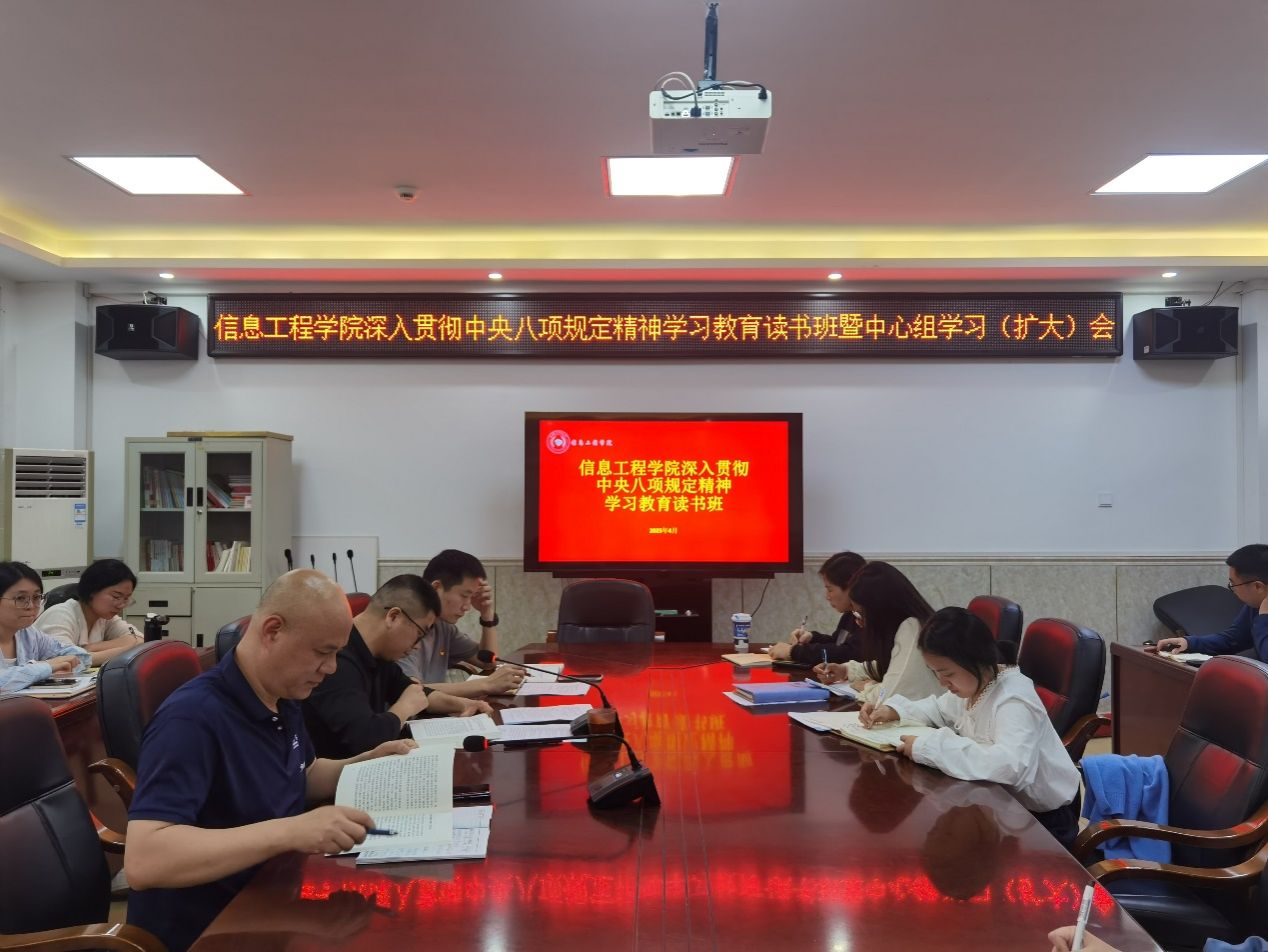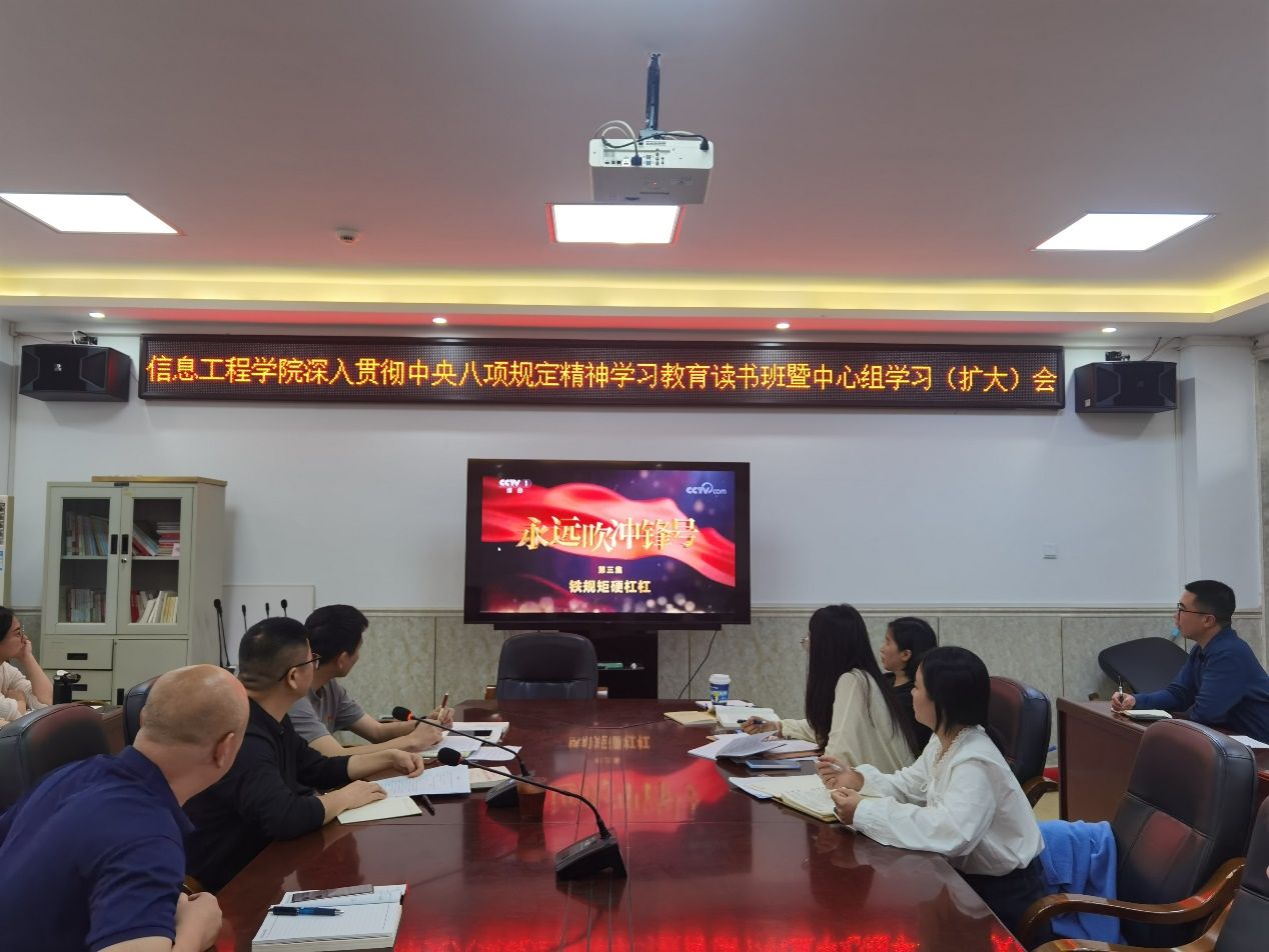 4月23日,信息工程学院召开深入贯彻中央八项规定精神学习教育读书班暨理论学习中心组(扩大)会议。全体教职工参加了此次学习,会议由党总支副书记(主持工作)陈云德主持。