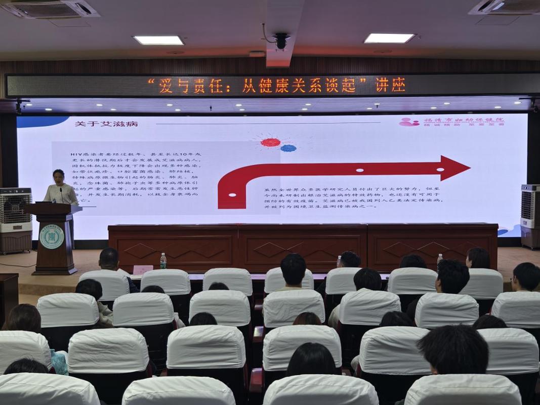 在讲座上,王芳云书记以“爱与责任”为核心,从人际交往与健康关系入手,结合典型案例深入浅出地讲解了艾滋病的传播途径、发病机理、预防措施以及国家“四免一关怀”等相关政策。她指出,青年学生正处于身心发展的关键时期,树立正确的性观念、培养健康的生活习惯、懂得自我保护是远离艾滋病的根本。她特别强调,“爱”不仅意味着情感上的投入,更意味着一份对自身、对伴侣、对未来的“责任”,而保持健康、预防疾病正是这份责任最直接的体现。