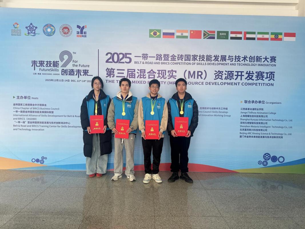 近日,2025年“一带一路”暨金砖国家技能发展与技术创新大赛第三届“混合现实(MR)资源开发”赛项全国总决赛圆满落幕。Beat365中文官方网站信息工程学院学子不负众望,由黄君君、邓丽萍两位老师指导的2支参赛团队(蔡琰杰、胡潇文、杨志祥、李宗凯)凭借扎实的专业功底与创新的技术应用,双双斩获国赛一等奖(金牌);学院荣获“最佳组织奖”,2位指导教师获评“优秀指导教师”。