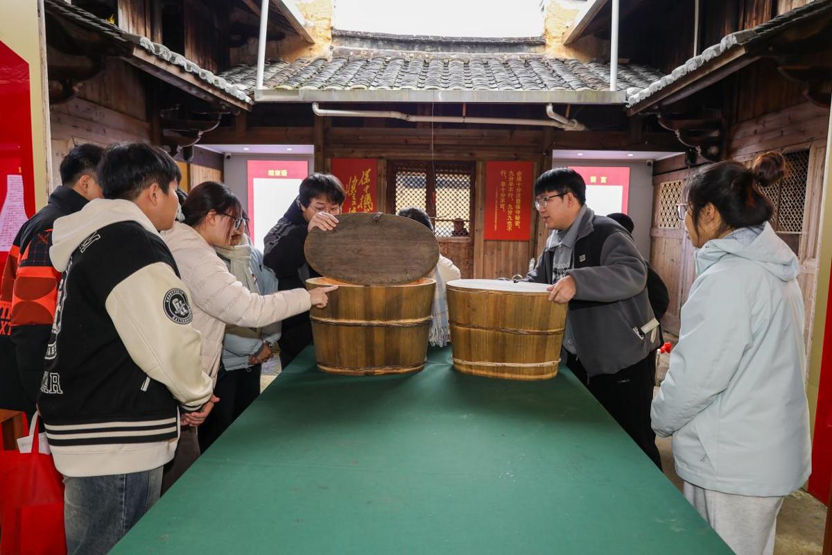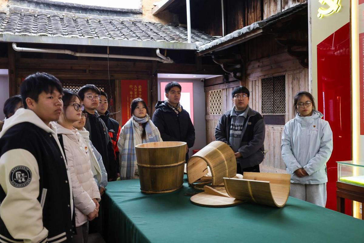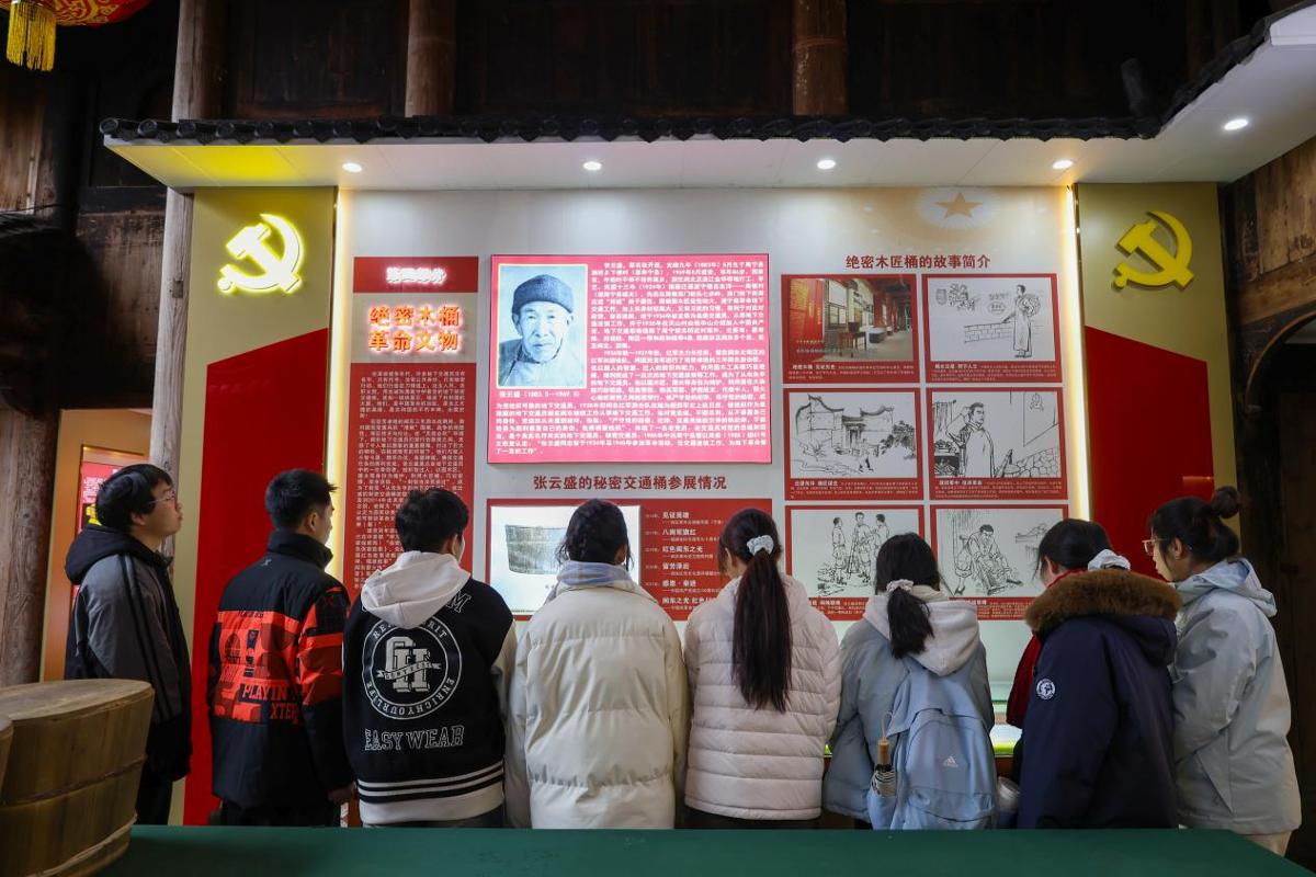 实践团首站抵达泗桥乡下楼村,探访了隐蔽战线的英雄——张云盛先生的故居。在简朴的老屋中,队员们跟随讲解员的步伐,凝视着那个看似寻常却曾承载过生死攸关情报的木桶,聆听讲解员讲述那段惊心动魄的往事。作为一位以木匠身份为掩护的地下交通员,张云盛凭借精湛手艺和过人胆识,巧妙利用木桶夹层传递重要信息,默默支撑起闽东革命的信息脉络。一件朴素的劳动工具,成为忠诚与智慧的不朽见证。实践团师生们触摸木桶上的岁月痕迹,仿佛能感受到当年那份沉甸甸的信任与危机四伏下的冷静从容,深刻体悟到革命先辈于平凡岗位中坚守信仰、于无声处听惊雷的非凡品格。此外,实践团成员在讲解员的带领下了解到其他红色地下交通线的峥嵘故事,系统学习了总体国家安全观等知识,深刻感受到保密工作的重要性,感悟保密工作事关国家安全的重要性。