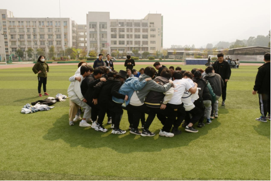 万里长城永不倒,班级所有人围成一个圈,在不借用双手的情况下,前一个人坐在后一个人的腿上,虽然累,但是同学们紧紧团结在一起,互相鼓励、咬牙坚持,不仅增强了班级凝聚力,也充分体现了各班级团结一心的友好氛围。