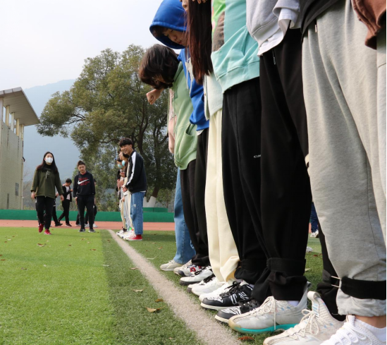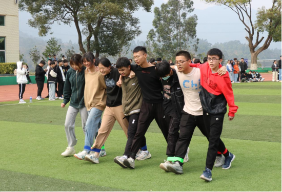 八人九足,八名同学的双腿绑在一起,待发令员,即出发,到达终点用时最短的队伍获胜,选手们整齐有力的口号声和划一的步伐尽显班级默契。