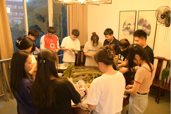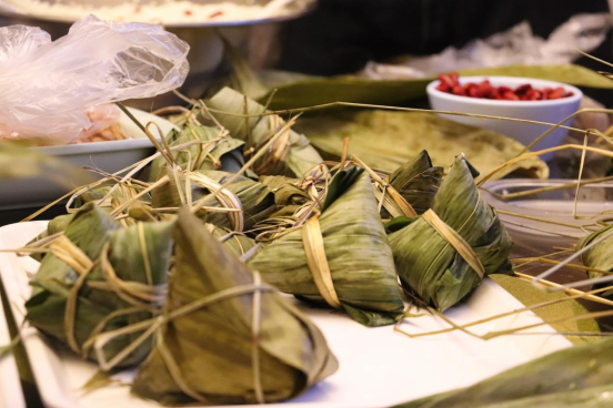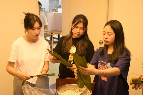 活动现场,颗粒饱满的糯米、蜜枣、红豆、虾仁粽叶等原材料整齐地摆放在桌子上,大家摩拳擦掌、跃跃欲试。粽子虽小,门道不少,一捧糯米、三两张粽叶、几个红豆、虾仁,粽叶卷成漏斗状后,舀糯米,到封口绑绳子定型……几位少数民族同学在老师同学们的指导下包起了棕子。大家互相讨教切磋,不断学习,手法从生疏到熟练,其中不断有奇异形状的粽子出现,让人忍俊不禁,现场欢声笑语不断,尽情渲染着端午的节日氛围。经过努力,各式各样的粽子在一双双巧手中诞生了,满满一桌的粽子让整个食堂都填满了浓浓的端午气息,也让异乡的同学感受到浓浓的端午情和家的温暖。一段欢乐的包粽子环节结束后,同学们品尝了自己的劳动成果,总有几个粽子又甜又咸,引得同学们哭笑不得。