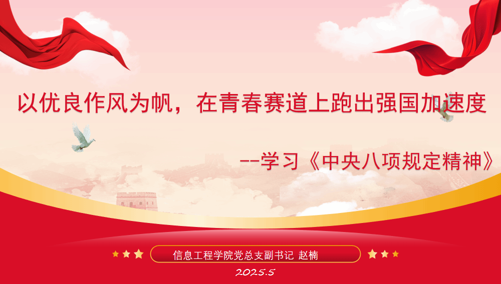为深入学习贯彻中央八项规定精神,强化师生党员使命担当,5月16日,信息工程学院党总支副书记赵楠以《以优良作风为帆,在青春赛道上跑出强国加速度》为题,为学生第二党支部全体党员讲授专题党课。