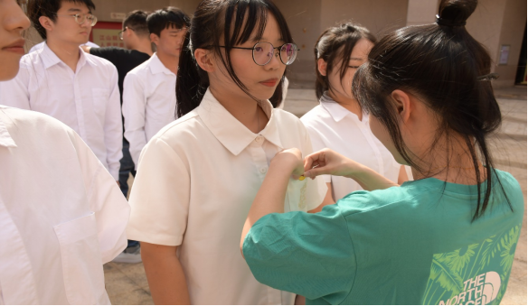 (教师党员为新党员佩戴党徽)