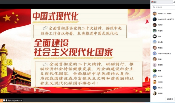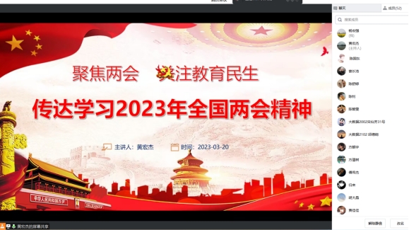 党课上,黄宏杰副书记领学了2023年“两会”内容和政府工作报告,他希望支部师生党员们一要主动学习贯彻习近平总书记系列重要讲话精神、党的二十大精神和全国“两会”精神,做到“真学”“会用”,承担起应有的时代责任与担当;二要努力学习专业知识,发挥专业优势,提升就业竞争力,主动将个人理想融入党和国家发展事业中,坚定理想信念,提高政治站位,以实际行动为中国式现代化建设贡献一份力量。与会师生党员认真聆听,积极进行线上互动,表示将从自身做起,关注时事热点,学好专业知识,锤炼技能本领,为祖国的经济社会建设贡献青春力量,把学习宣传贯彻党的二十大精神和“两会”精神落到实处。