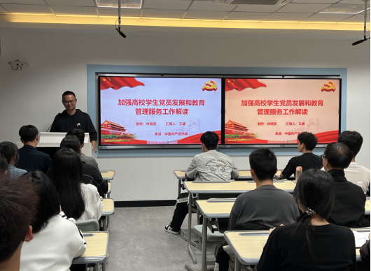(党总支委员王盛进行《加强高校学生党员发展和教育管理服务工作解读》授课)