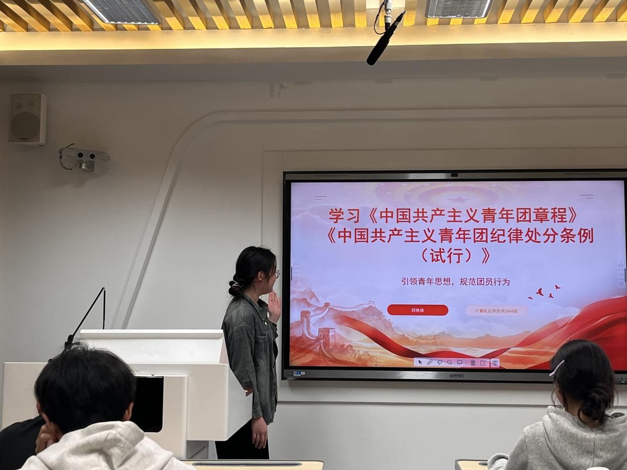 活动采取线下形式开展,内容丰富多样,包括个人自学、团干部领学和分组讨论等环节。其中在团干部领学环节,通过图文并茂的方式生动地呈现了团章和团纪处分条例的历史沿革、核心要义及具体的条文规定,帮助团员青年更深入地理解和把握文件精神。分组讨论环节,团员青年们积极发言,分享学习心得,探讨如何在日常学习和生活中贯彻《中国共产主义青年团章程》《中国共产主义青年团纪律处分条例(试行)》的要求。