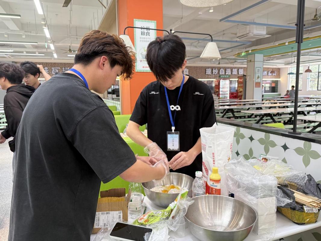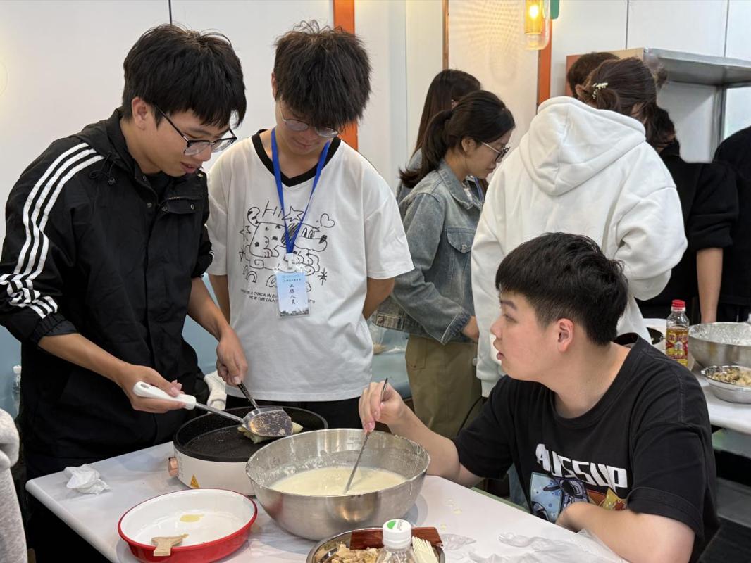 活动伊始,工作人员详细讲解了碧玉卷与竹编的制作流程和技巧。随后,各小组志愿者有序就位,认真投入实践环节。在碧玉卷制作区,同学们调面糊、摊面皮、包馅料,忙得不亦乐乎;取煎锅,刷薄油,倒面糊,待边缘微微卷起,一张融合秋日暖意的碧玉卷便跃然眼前。另一边的竹编区域同样气氛热烈,同学们有条不紊地摆放竹篾,采用“压一挑一”的编织技法,辅以胶带固定,最后以五彩绳系紧,一艘艘精巧的竹编小船逐渐成型。