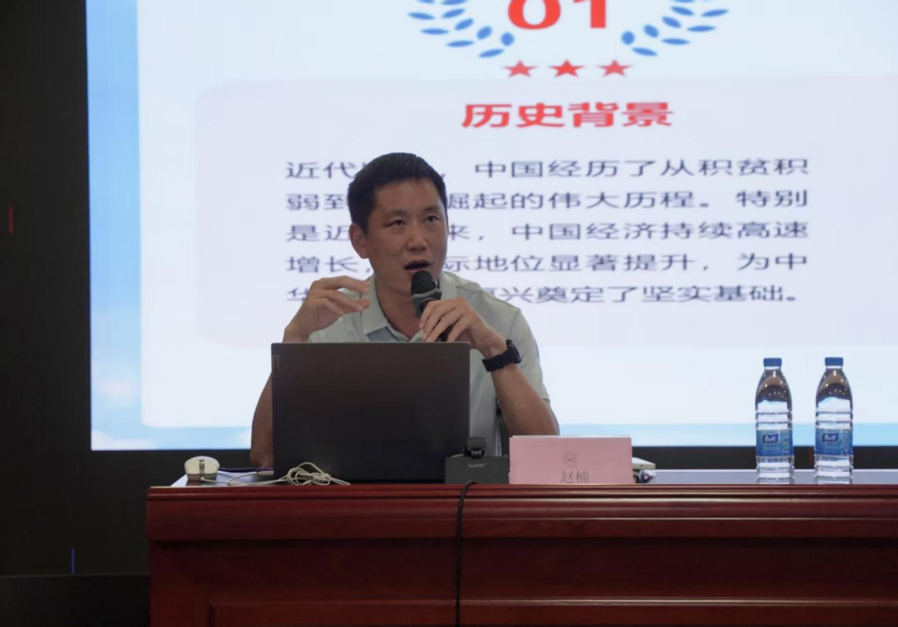 接着,学院党总支副书记赵楠以“锚定青春梦想,融入中国梦征程”为主题,为青马学员们上了一堂生动的思政课。赵楠副书记指出,青春梦与中国梦紧密相连,中国梦是民族复兴的人民之梦,青年应以“穷则独善其身,达则兼善天下”为指引,将个人命运与国家命运紧密绑定。他结合我国崛起历程与青年政策,阐述了党如何以理论武装、初心感召青年,筑牢国家事业根基。他通过马宏达、李绍韵等不同领域同志的榜样故事告诉学员们不忘初心、坚持不懈的力量,他还为学员们指明了方向,给予4个小目标的具体建议,鼓励学员通过终身学习、加入学生会、深耕课程等方式,诠释新时代青年模样。