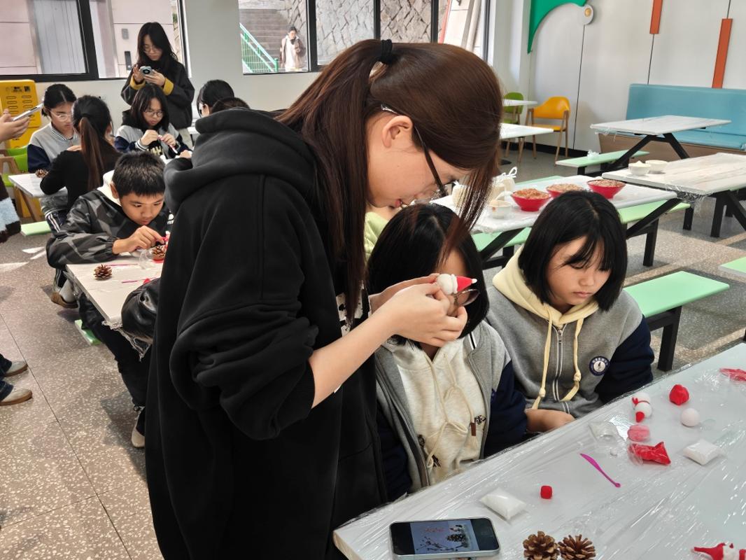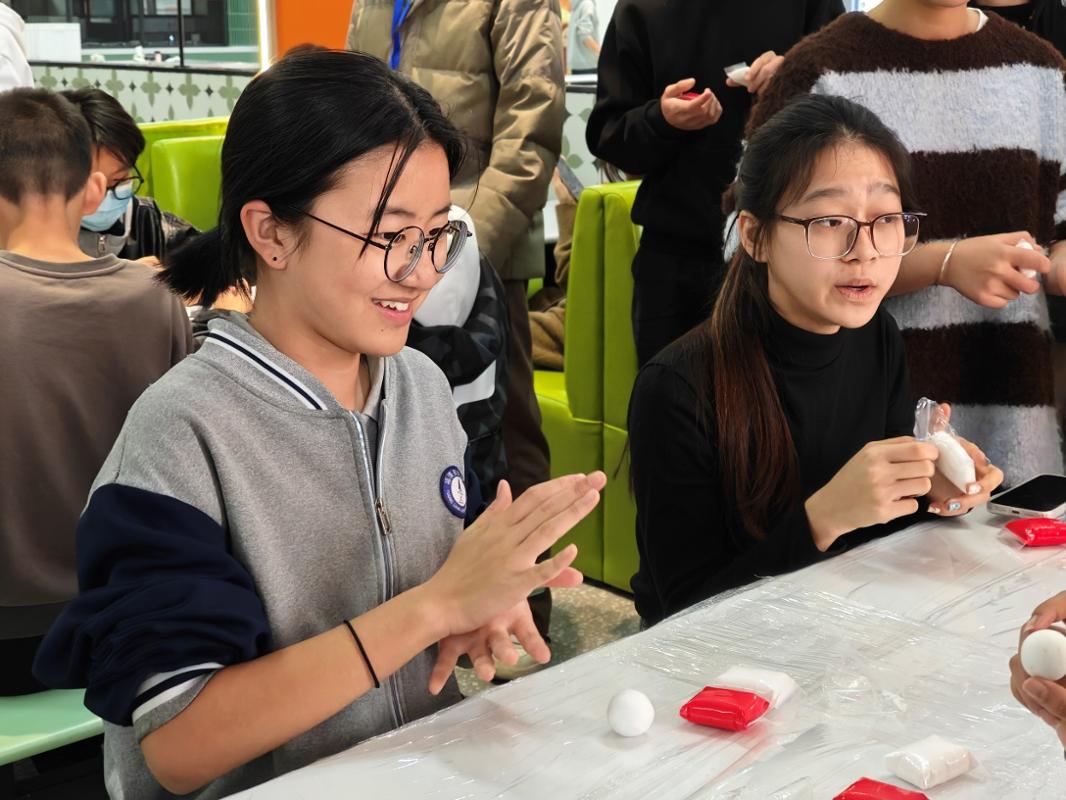 指尖暖冬日,劳动绽芳华。本次活动精心设置了巧手包饺子与创意黏土雪人两大趣味环节。活动现场,各参赛小组摩拳擦掌,从和面、擀皮、调馅到包制,分工明确,配合默契。原本普通的食材在同学们手中焕发出创意与巧思。与此同时,在“手工组”,各色黏土在指尖揉捏、塑形,两校师生互相指导,共同设计,一个个憨态可掬、独一无二的黏土雪人逐渐成型。大学生与中学生们混合编组,大手小手协同合作,两校师生在紧密协作中迅速拉近距离,交流心得,分享乐趣。