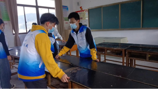 (志愿者为支教课堂排整桌椅,做课前准备)