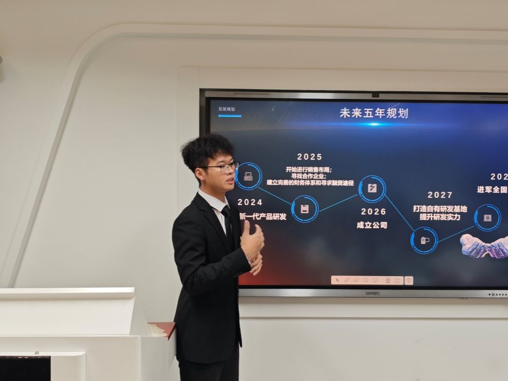 在答辩环节,评委老师们从项目创新性、商业可行性、团队配合、市场竞争力等多个维度,对参赛项目进行针对性的提问。点评中,党总支副书记(主持)陈云德,充分肯定了参赛团队积极进取的态度,高度评价项目中蕴含的创新潜力,鼓励大家保持探索热情、不畏挑战。