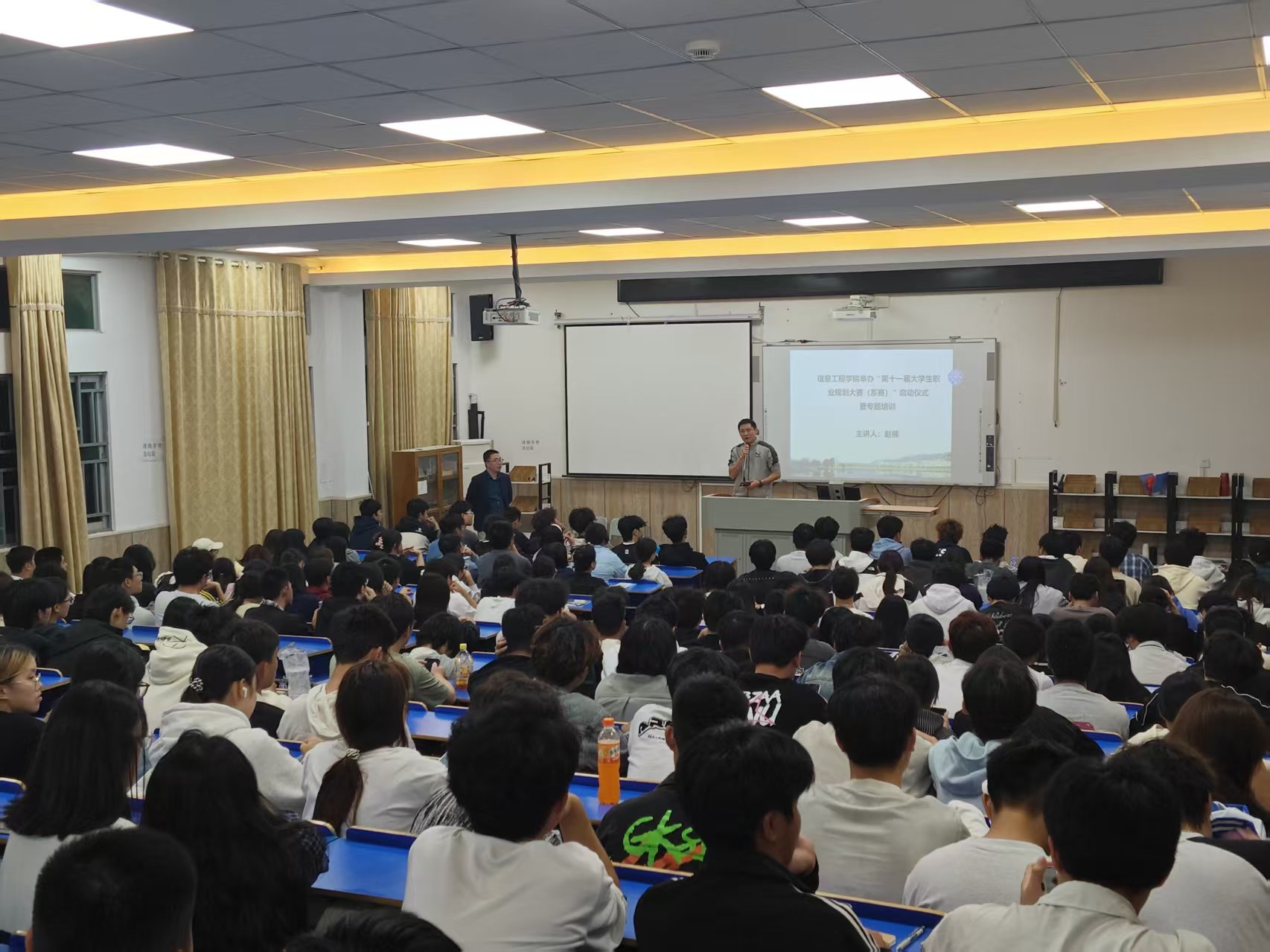 为深入贯彻落实教育部关于举办第三届全国大学生职业规划大赛的通知精神,进一步提升Beat365学生的职业规划能力和就业竞争力,信息工程学院于2025年10月23日下午在教学1号楼105教室举办“第十一届大学生职业规划大赛(系赛)”启动仪式暨专题培训。学院党总支专职副书记赵楠、全体辅导员及200余名学生代表参会,会议由就业辅导员范声斌老师主持。
