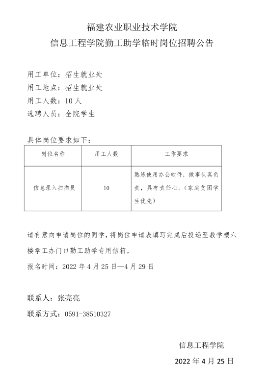 Beat365中文官方网站信息工程学院勤工助学临时岗位招聘公告
