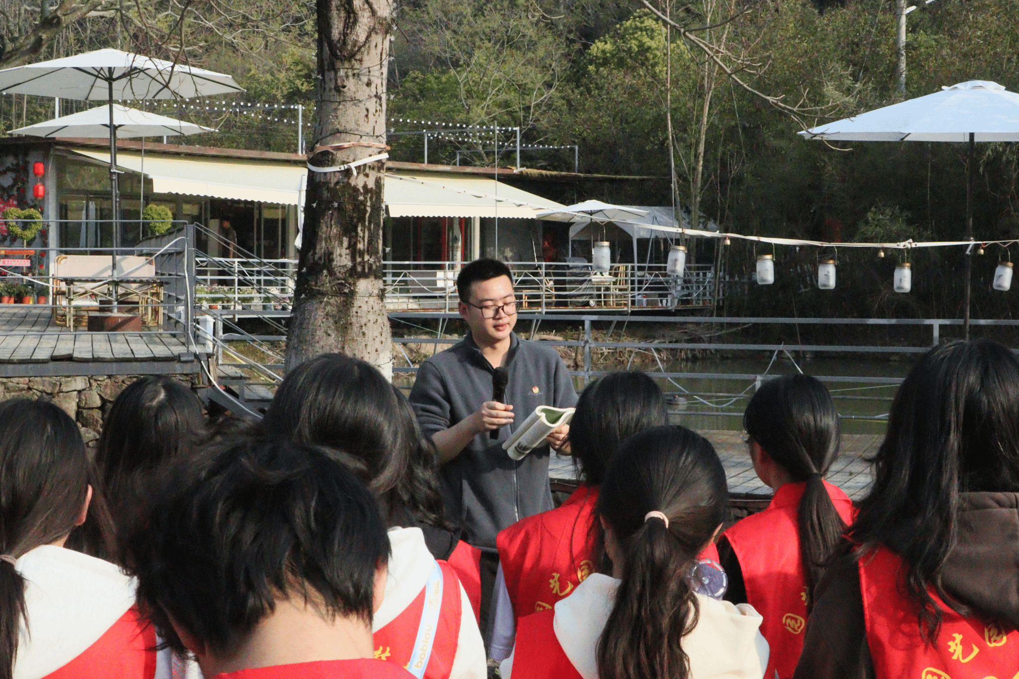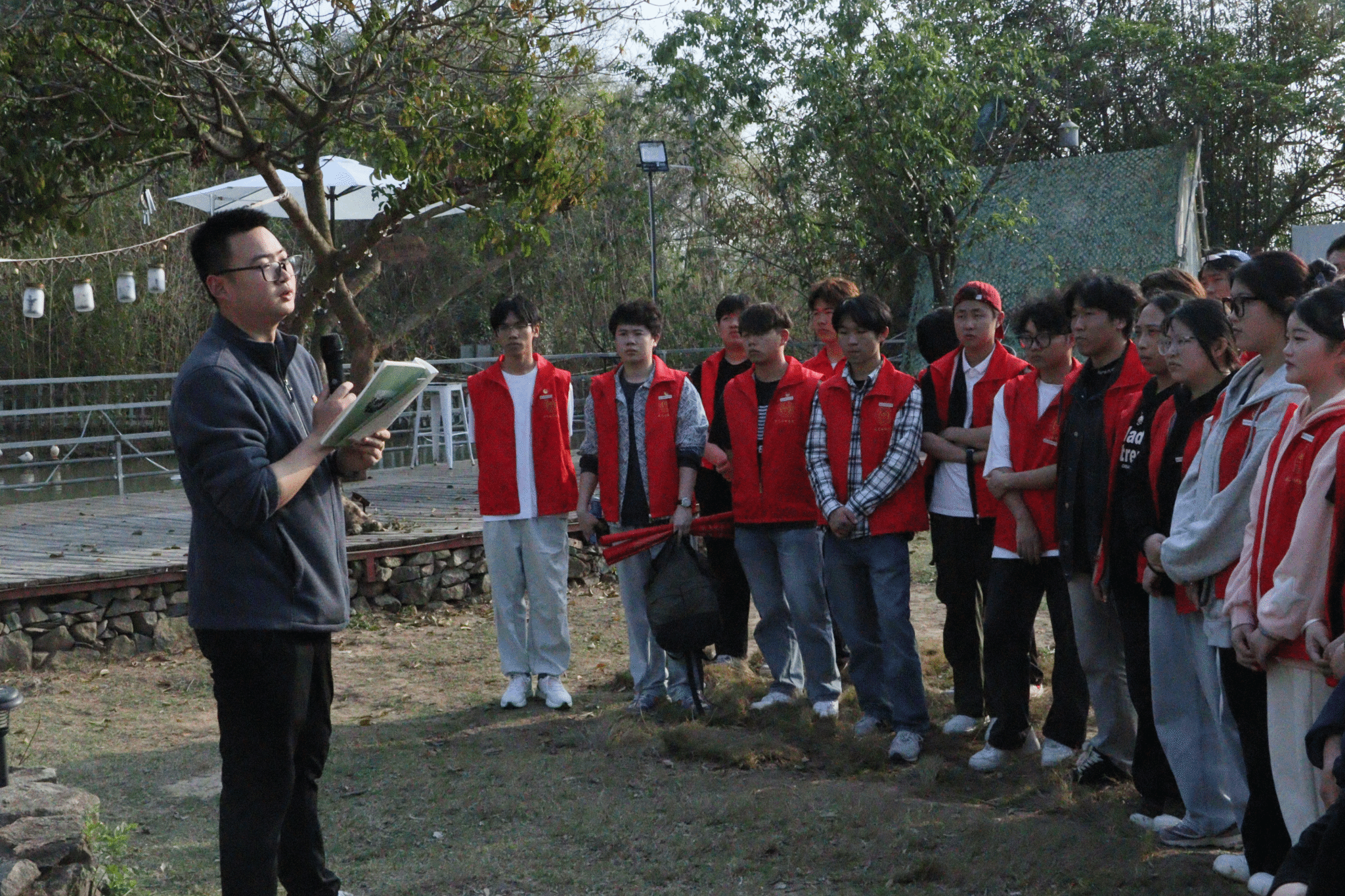 活动中,团学干部们在老师们的带领下挥锹铲土、扶苗培土、提桶浇水,分工协作种植了30余株树苗,其中包括木麻黄树苗。木麻黄是“四有书记”谷文昌带领东山人民制服风沙的“生态卫士”,选择这一树种,意在致敬其坚韧不屈的精神品格。植树结束后,全体人员在树下集中,院团委书记林雨龙老师以《木麻黄下的初心》为题,现场讲述谷文昌书记扎根东山14年、带领群