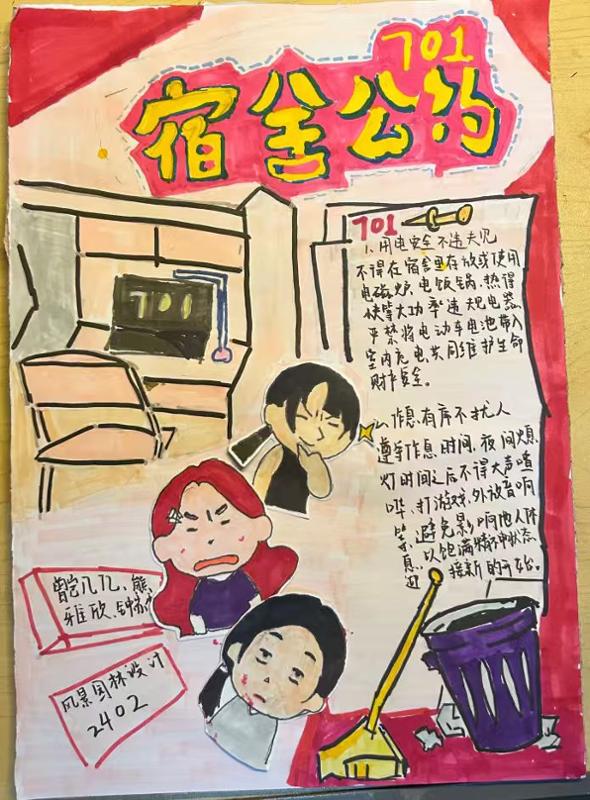 这些充满巧思的海报,不仅是创意的展现,更是同学们对文明宿舍建设的真诚倡议。笔尖流转的是设计灵感,心中承载的是对“家”的热爱与责任。愿这份创意延续,让文明成为宿舍生活中最美的风景。