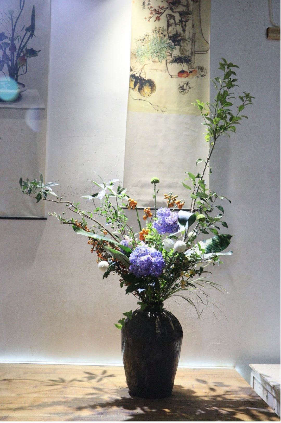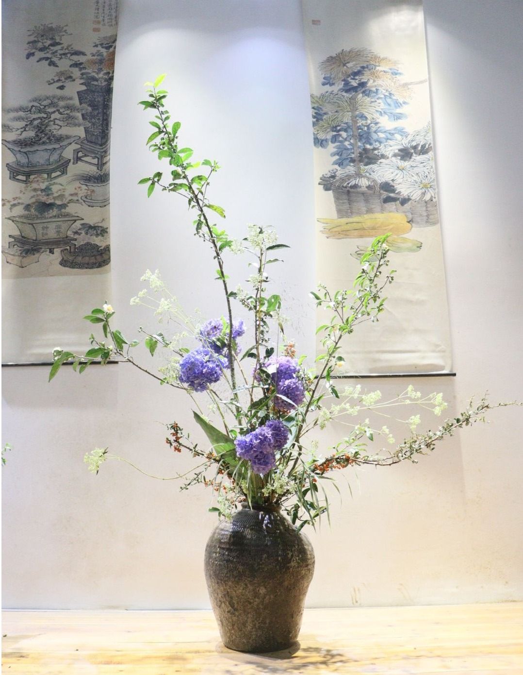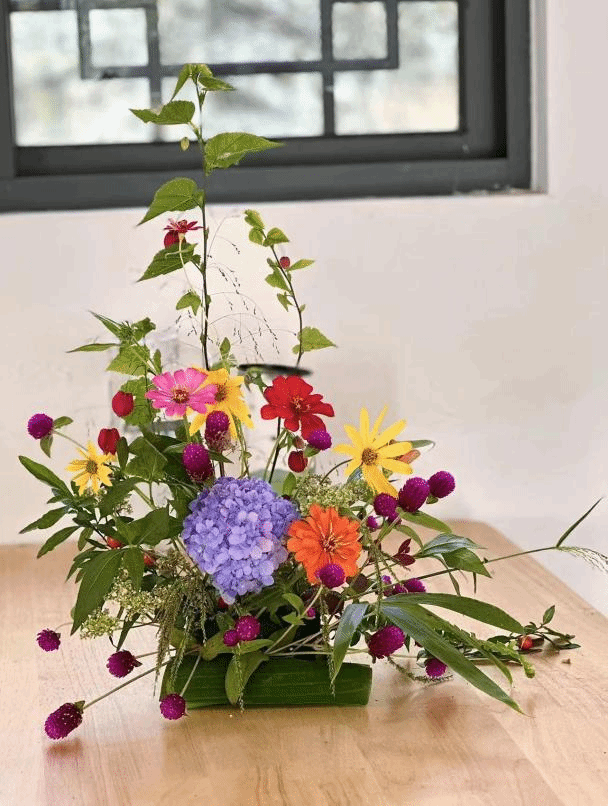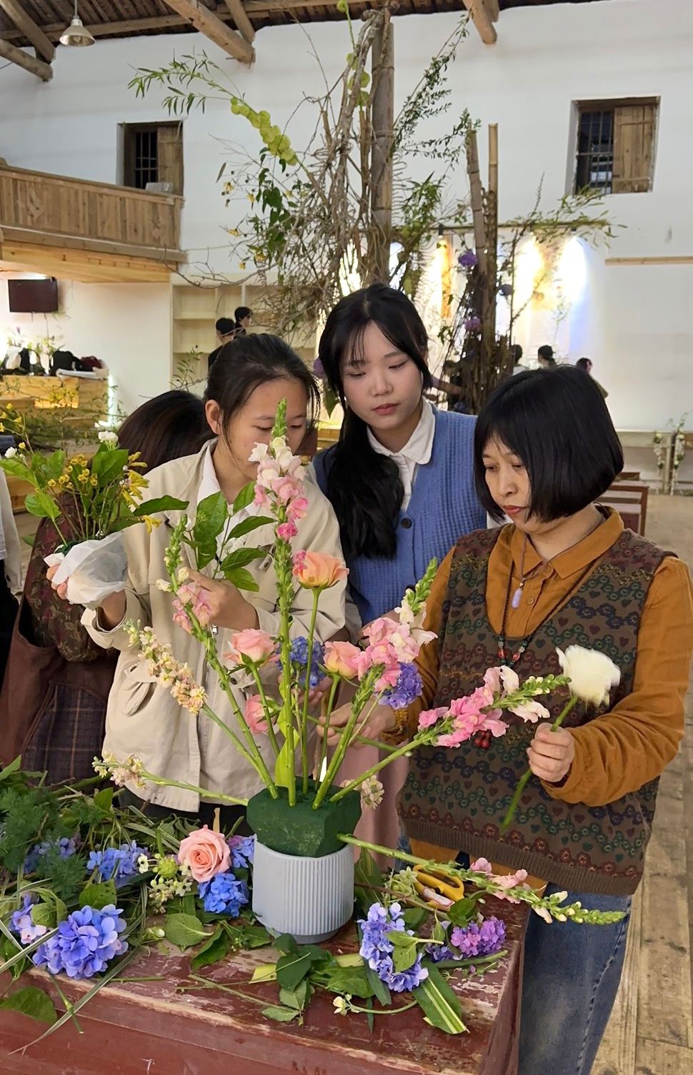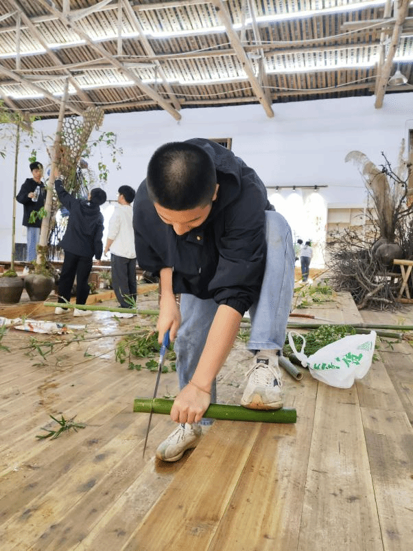 活动中,花卉生产与花艺专业学生结合自身专业所学、以绣球花为主题、就地取材,用自己灵巧的双手,将采来的花材,配以枝叶点缀,精工裁剪,再根据不同的色彩、形状整合到一起就形成了一幅幅独具匠心又饱含深意的插花作品。