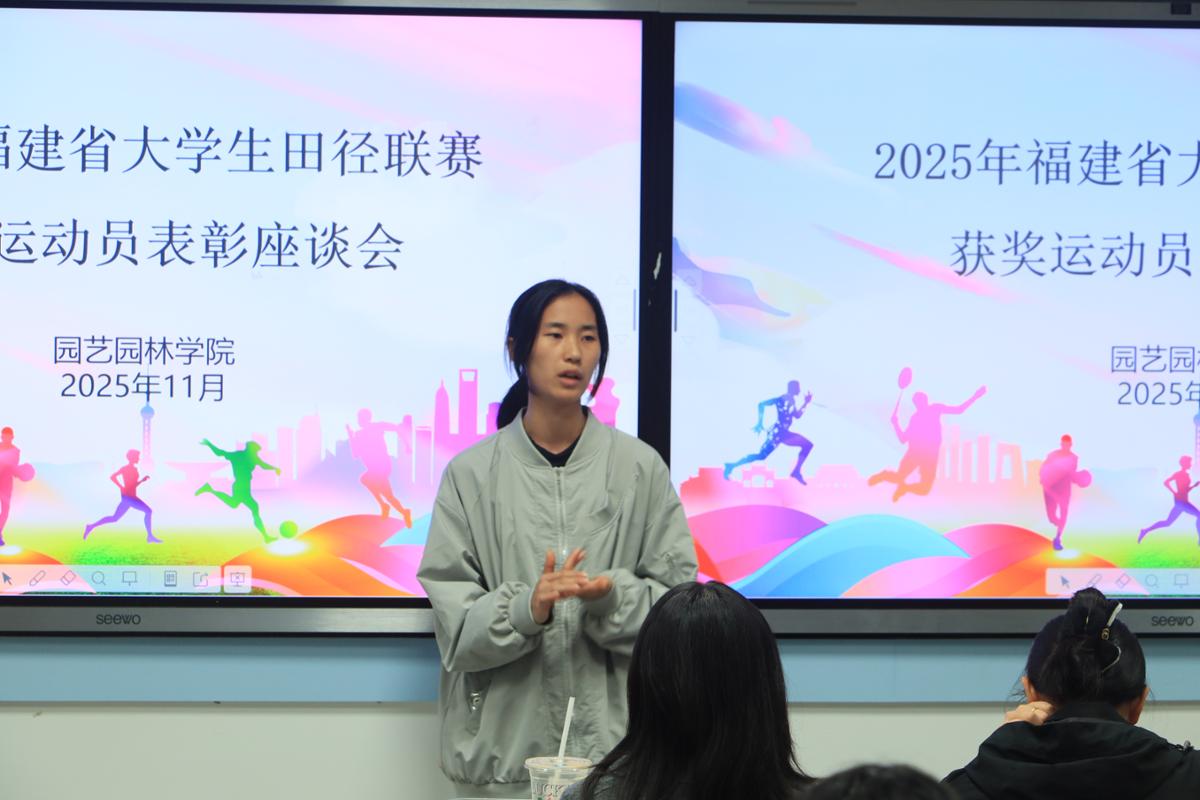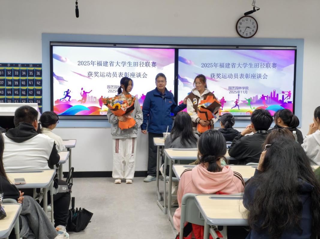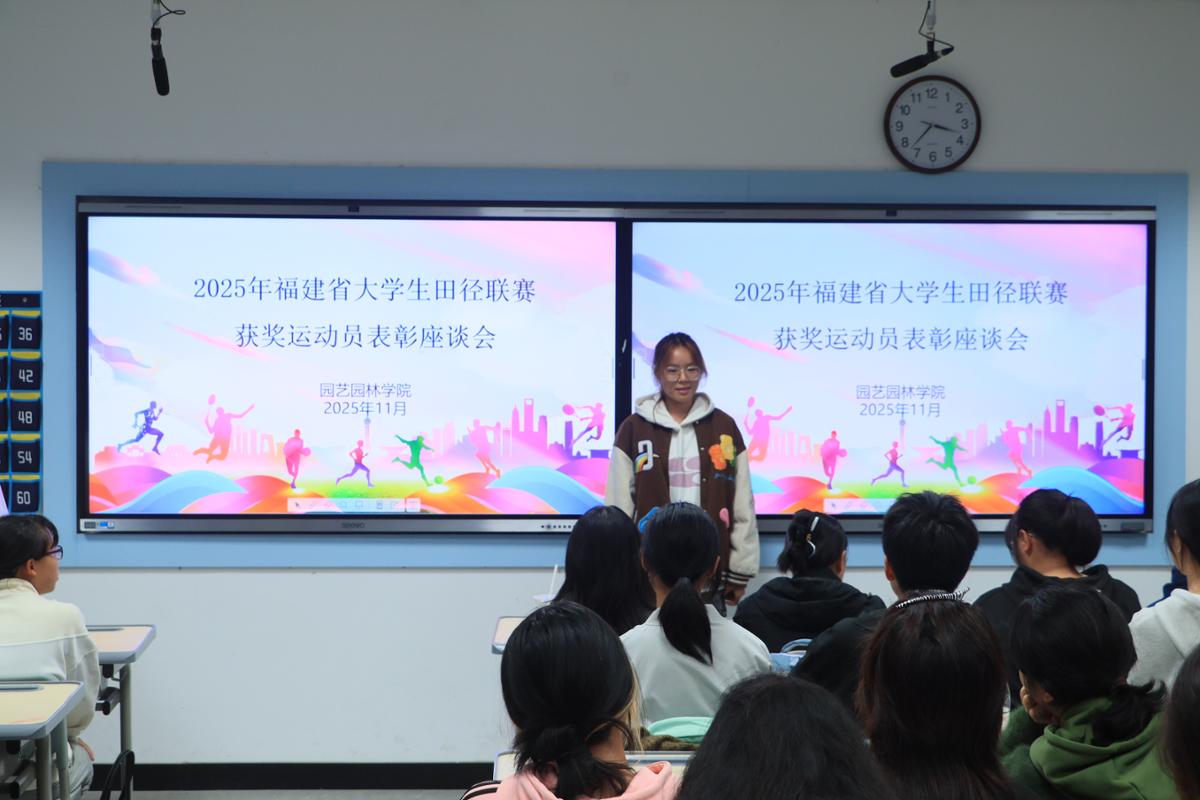 随后,获奖学子分享成长感悟。田佳旭在发言中表示:“这次福建省大学生田径联赛获得金牌和银牌,让我感到很激动。每一次突破自我都离不开平时的刻苦训练和老师们的支持鼓励,也希望省赛中的经验能帮助大家,希望大家在校运会中取得更好成绩”。