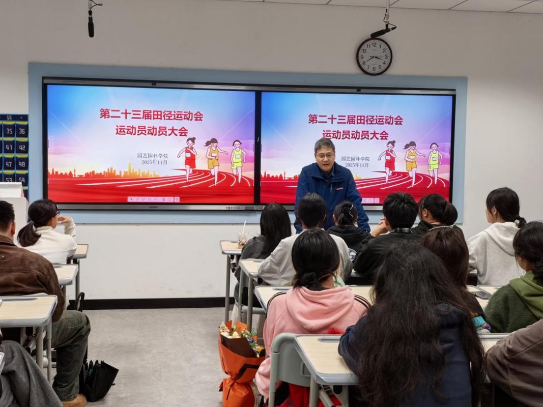 2025年11月4日,园艺园林学院在教学楼1号楼109教室召开第二十三届校运会动员大会。大会以表彰省赛优秀学子、凝聚备战合力为主题,为即将到来的校运会吹响冲锋号。学院党总支书记徐捷、副书记李雪宁、学工办主任沈云玉及全体校运会参赛运动员参会。