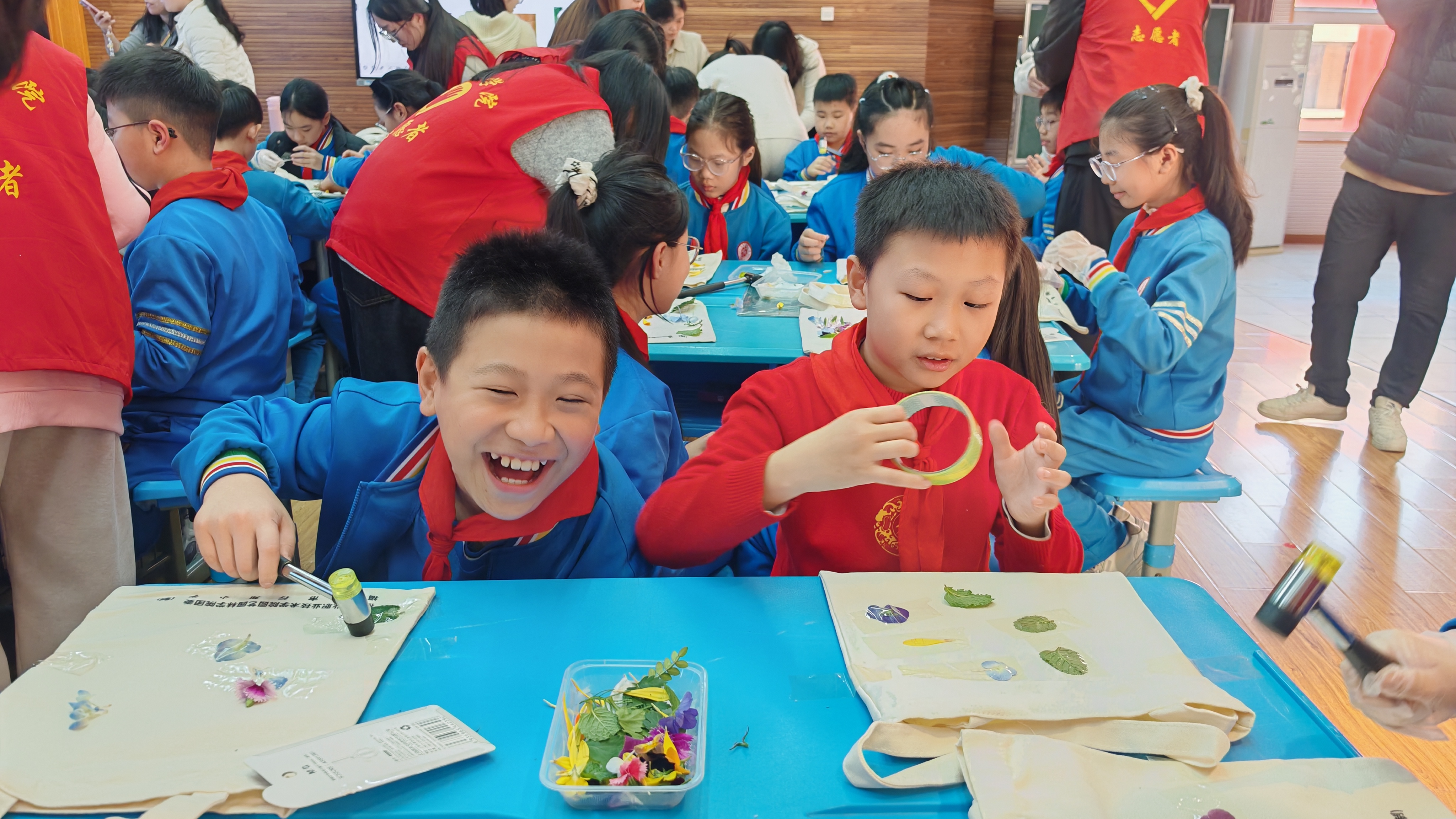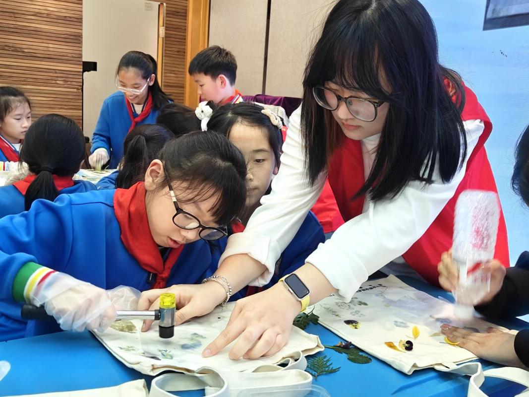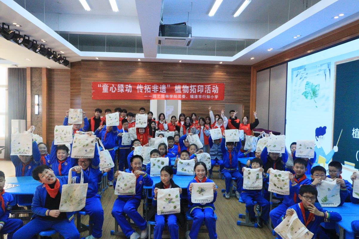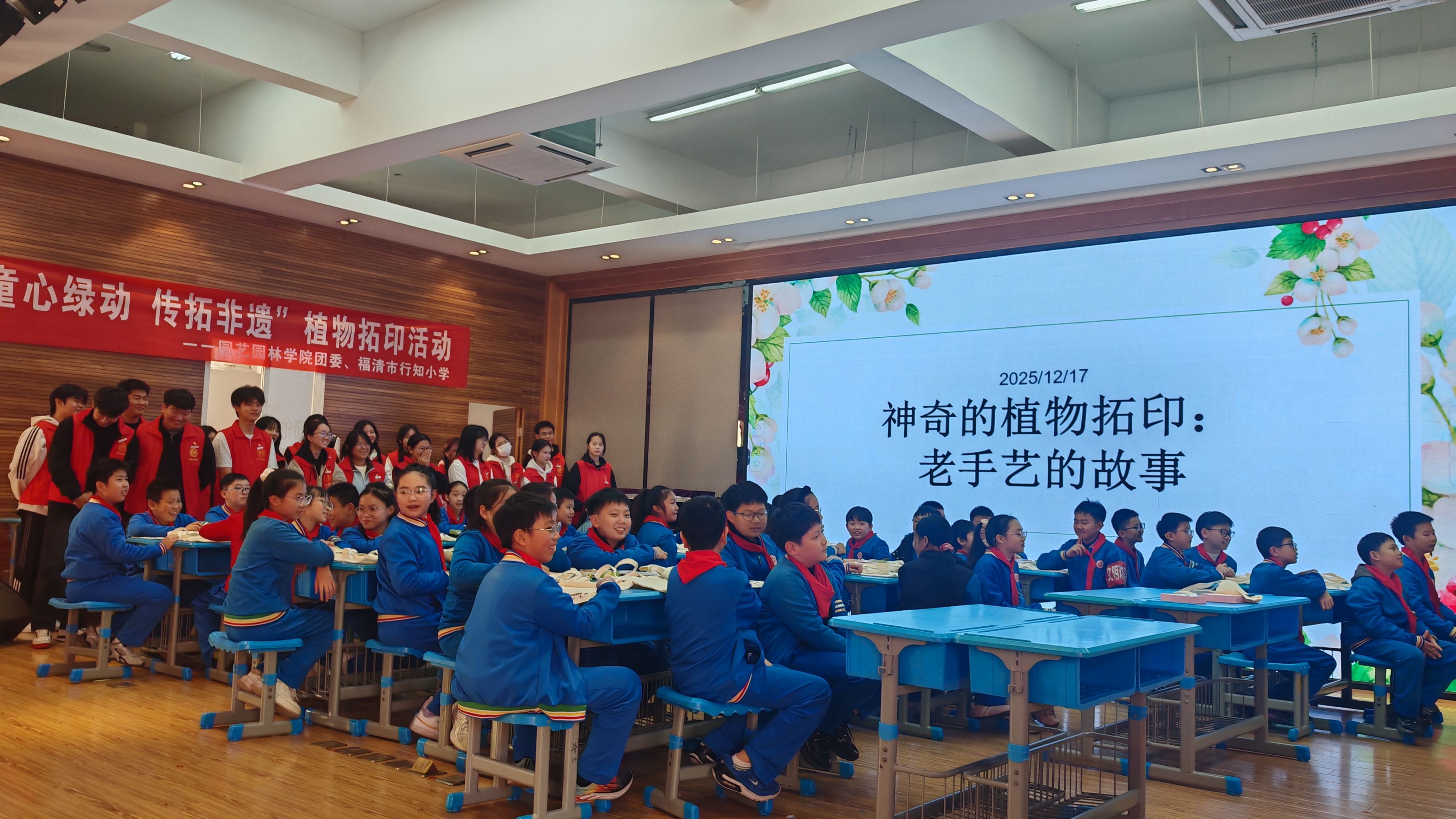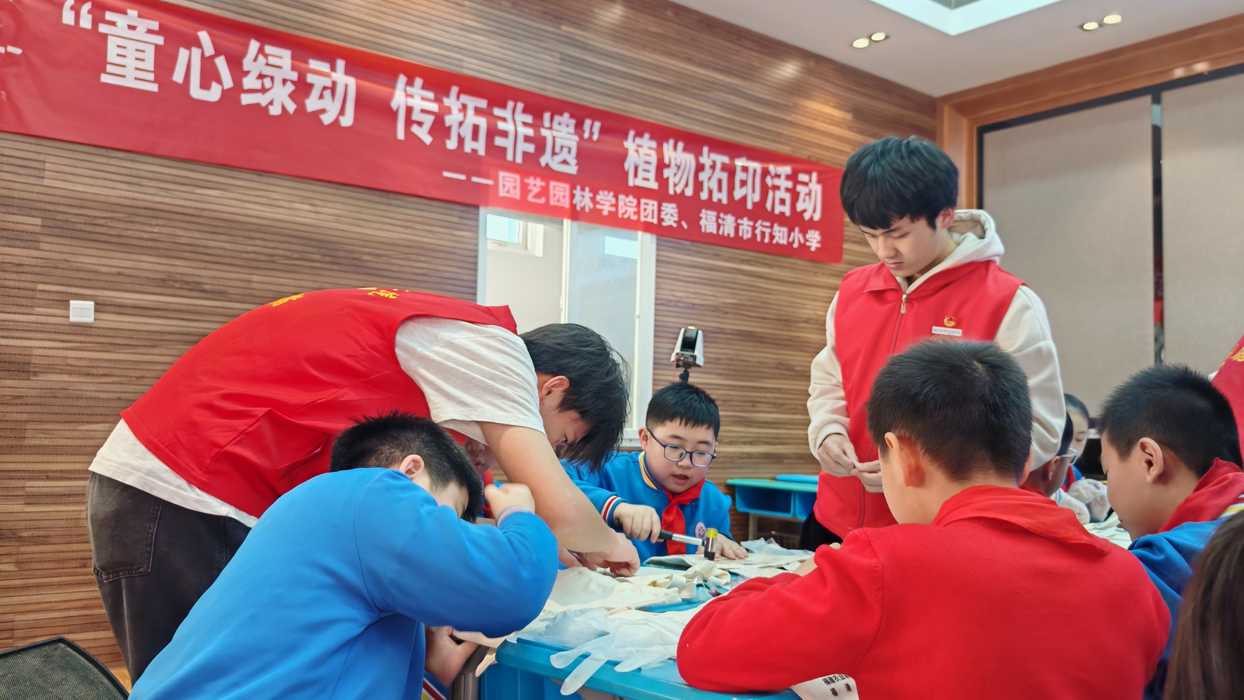 2025年12月17日下午,园艺园林学院团委联合福清市行知小学,开展“童心绿动 传拓非遗”植物拓印主题活动,52名小学生在趣味实践中近距离感受非遗文化魅力。活动由学院党总支副书记李雪宁、团委书记林雨龙带队,25名“园小艺”志愿服务队队员全程组织开展。