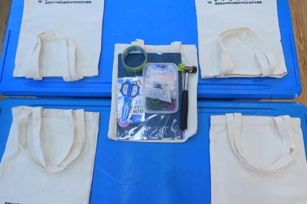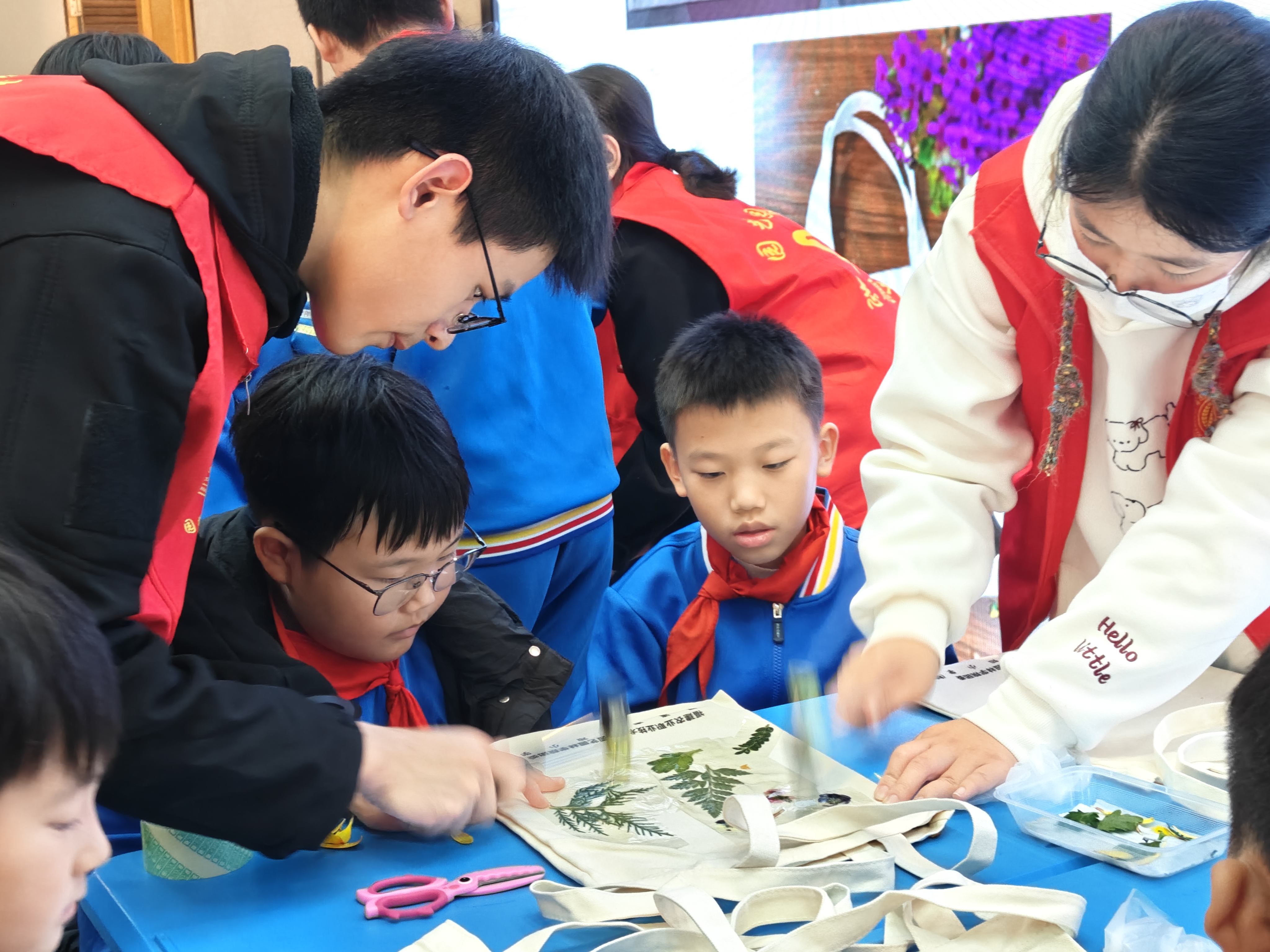 随后,在志愿者们的辅导下,小朋友们分组进行了动手拓印实践。现场准备了丰富的材料,包括帆布袋、胶带、锤子、儿童款安全剪刀、垫板等,确保每位小朋友都能安全、顺利地完成自己的拓印作品。活动中,孩子们充分发挥想象力和创造力,将一片片树叶、一朵朵花瓣巧妙地组合在帆布袋上,通过敲打、按压等方式,将植物的自然形态和色彩完美地呈现在作品上。作品完成后,小朋友们手持自己亲手制作的植物拓印作品,脸上洋溢着满足和自豪的笑容,纷纷与各自的作品合影留念。