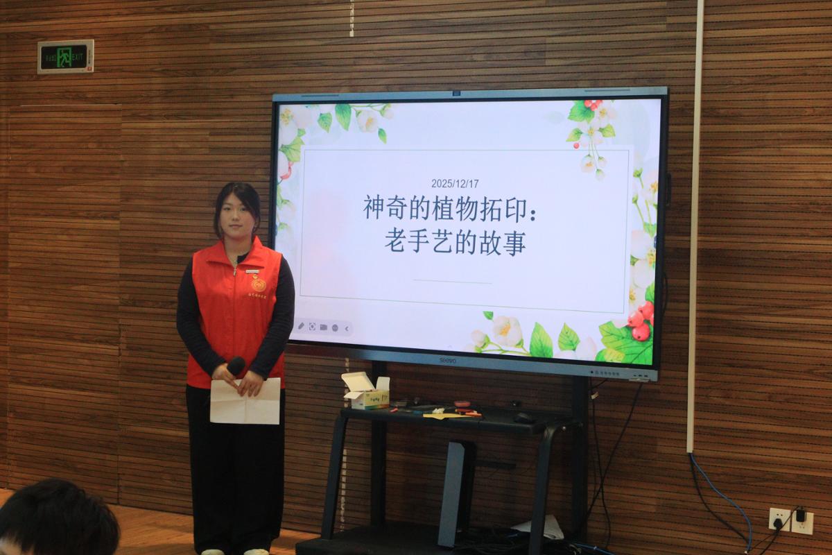 活动伊始,“园小艺”志愿者邵佳鑫同学为小朋友们详细讲解了植物拓印的起源历史、文化意义及基本流程。通过生动的图片展示和实物介绍,孩子们对这项传统技艺有了初步的认识和浓厚的兴趣。