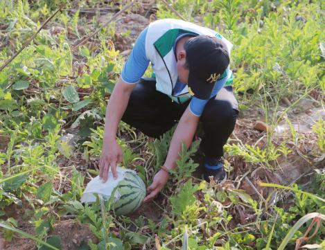 10日下午,实践团队在学院2020级果蔬班学员江邵滨的带领下,前往其创立的永安市丰凯新型农业发展有限公司山地西瓜种植基地。烈日下,实践团队虚心向江总及基地瓜农请教山地瓜的种植、养护和采摘技术,并在江总和瓜农的指导下动手选瓜、摘瓜、装瓜。在烈日的炙烤下,队员很快就汗流浃背、脸红耳赤,但他们依然坚持奋战在瓜地里,直至将运瓜的小皮卡装满。