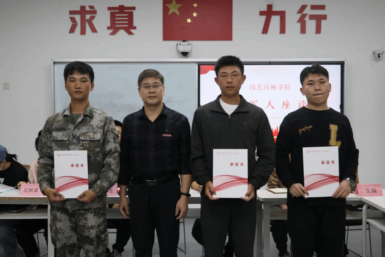 在座谈会上,林继彬老师首先向各位退役军人表示热烈欢迎,并强调了本次座谈会的目的是为大学生退役军人提供一个交流平台,帮助他们更好地适应校园生活,并继续发扬退伍不褪色的优良作风。随后21级、22级、23级退伍军人代表签署承诺书,并颁发纪念品。