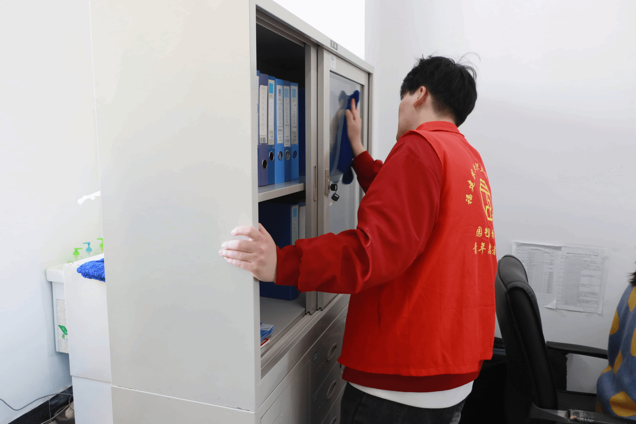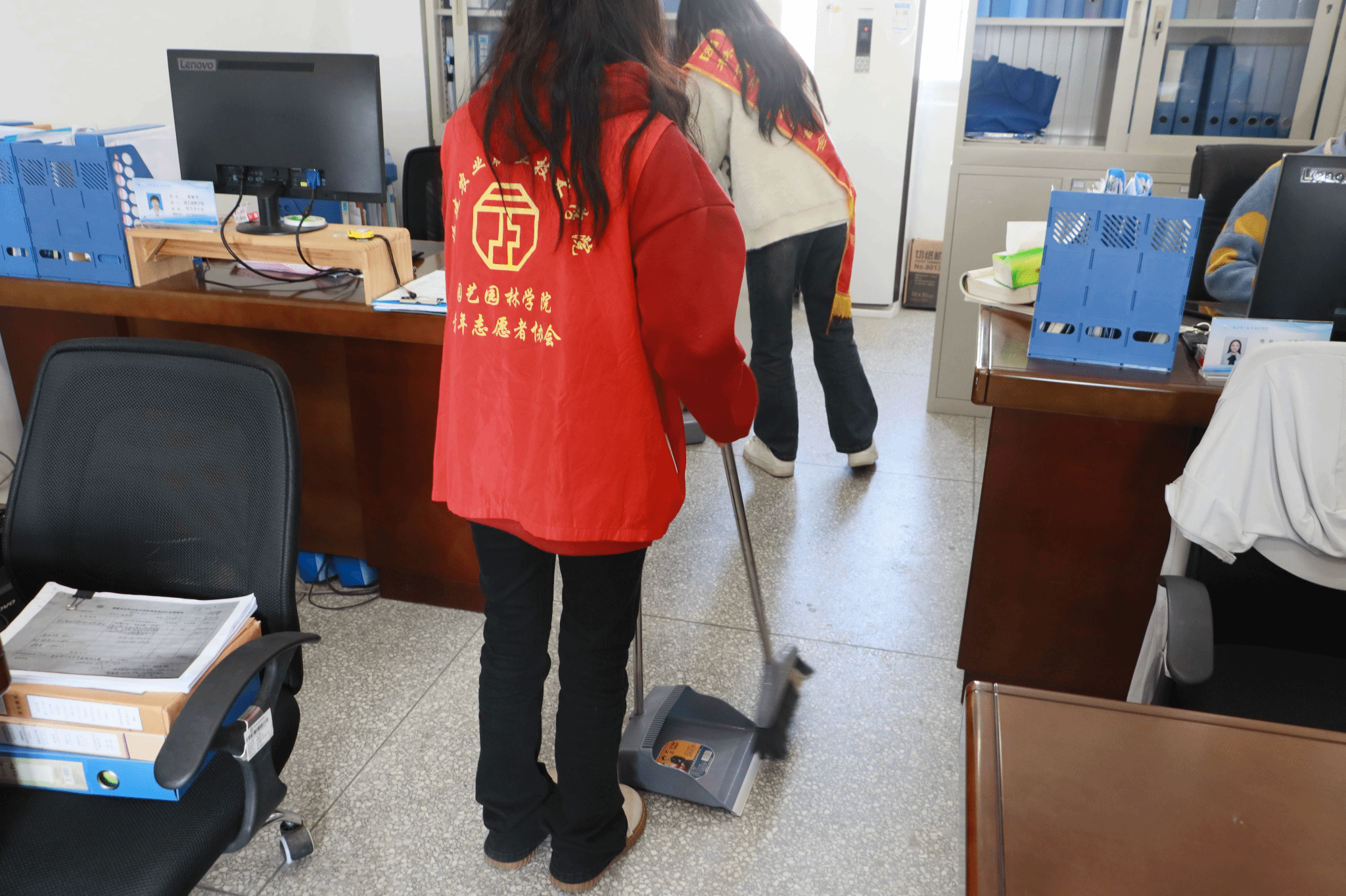 柔和的春风在校园里缓缓地吹着,所到之处都有志愿者们勤劳的身影。洁白无瑕的“素壁”与鲜艳夺目的“红绶带”相映成趣,在大家的共同努力下,教师办公区的环境面貌焕然一新,他们用辛勤的劳动换来我们干净舒适的校园生活环境。