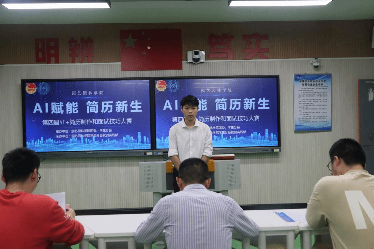 5月27日晚,园艺园林学院团委在教学2号楼404教室成功举办第四届AI+简历制作与面试技巧大赛。经过层层选拔脱颖而出的20位选手齐聚赛场,展开最终的角逐。园艺园林学院党总支副书记吴伯文老师、学院团委书记林雨龙老师参与此次活动。