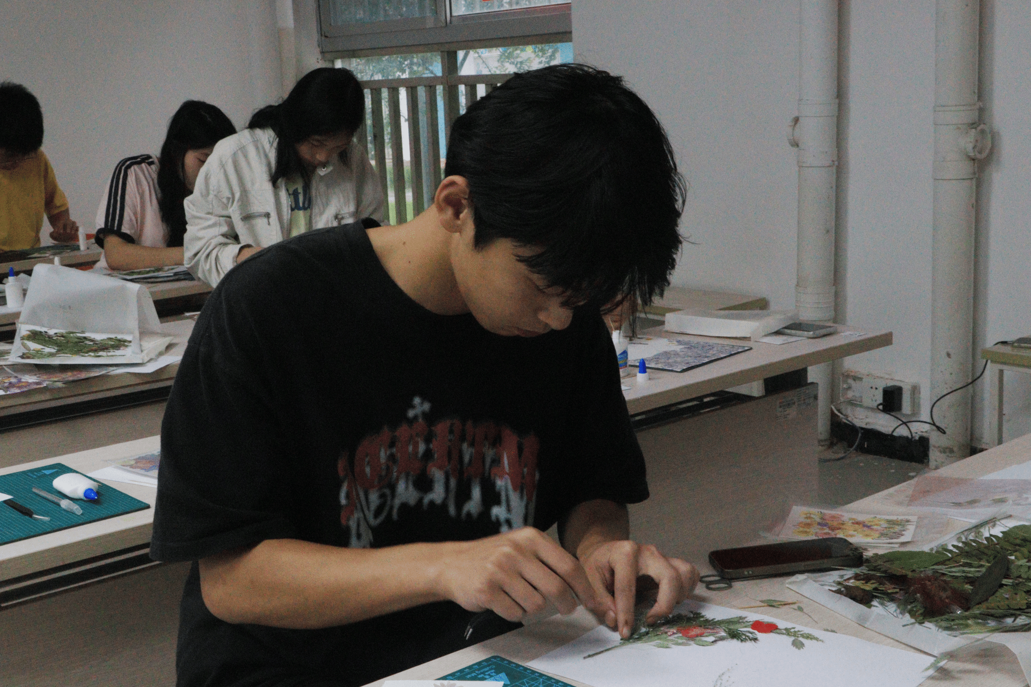 活动现场,同学们热情高涨。他们先将精心收集的花瓣与叶片整齐摆放在桌上,随后手持小刀,全神贯注地雕琢每一片花叶。削刻、涂抹胶水、轻轻按压……随着指尖灵动的操作,饱含巧思的图案逐渐成型,一幅幅融合端午元素与传统文化的创意作品在画纸上徐徐呈现。