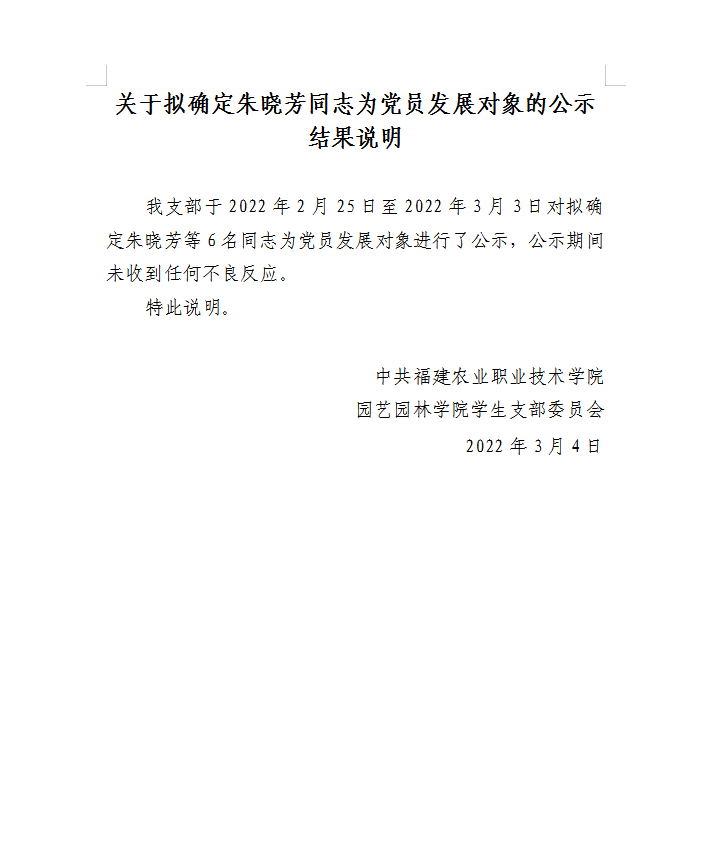 关于拟确定朱晓芳同志为党员发展对象的公示结果说明