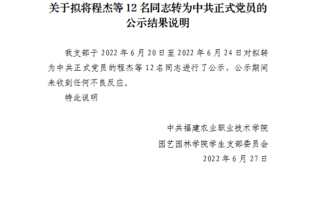 关于拟将程杰等12名同志转为中共正式党员的公示结果说明