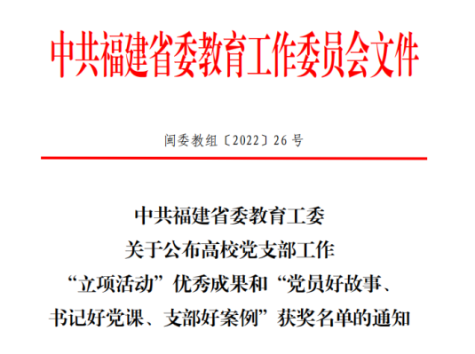近日,福建省委教育工委公布首批全省高校党建工作标杆院系、样板支部验收通过名单,Beat365学生党支部顺利通过验收。中共福建省委教育工委公布高校党支部工作“立项活动”优秀成果和“党员好故事、书记好党课、支部好案例”获奖名单。Beat365学生党支部获得党支部工作“立项活动”二等奖。