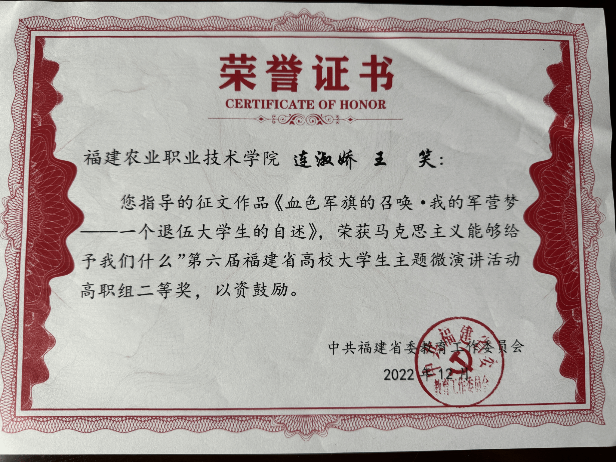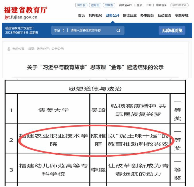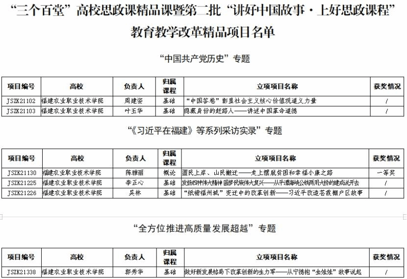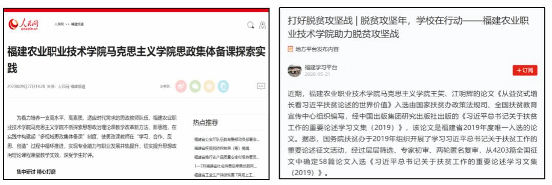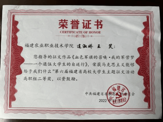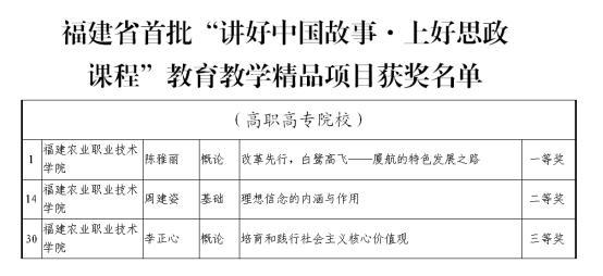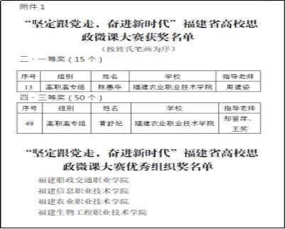 3.创新驱动,全面服务乡村振兴,品牌凸显新成效。打造“把思政直播课上到田间地头”“追梦新农人”“强农有我系列微课”等实践育人品牌,指导师生参加省级以上“领航计划”等各类思政课竞赛项目,学生团队获得省“一马当先”“团体优胜奖”1项、“团体三等奖”1项;获得省“马克思主义给予我们什么”优秀征文与微演讲二等奖2项;作品《用青春捍卫中华》在省“我爱国防”主题演讲比赛中获福州赛区复赛的优秀奖(唯一高职院校);深化马院微信公众号、官网等宣传平台建设,搭建对外窗口,打造“Beat365·大梦书屋”小课堂,其中二十大精神师生分享会活动受到东南卫视等媒体报道,思想政治教育领域影响力不断扩大。