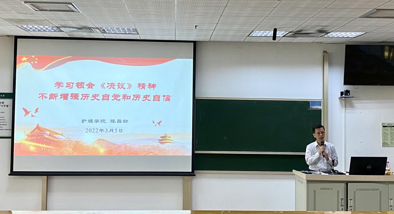 3月5日上午,陈昌龄书记在新教301课室为学院北校园全体本科生上了题为《学习领会<决议>精神,不断增强历史自觉和历史自信》的思政课。陈昌龄书记从“在重要历史关头回望历史,就是要让全党统一思想、增进团结、明确方向”“加深对党的历史的理解和把握,增强做中国人的志气、骨气、底气”“向历史学习,是我们党推进自我革命的重要途径”等三个方面阐述了《决议》如何彰显中国共产党的历史自觉和历史自信。他着重分析了总结党的重大成就和历史经验的重大意义。他说,从党的百年奋斗中看清楚过去我们为什么能够成功、弄明白未来我们怎样才能继续成功?中国共产党正是因为具有这样的历史自觉才能无往而不胜。陈昌龄书记希望同学们以史为鉴,以史自省,以史明志,不断坚定理想信念,并且善于从纷繁复杂的矛盾中把握规律,不断积累经验、增长才干,践行“强国有我、请党放心”的铮铮誓言!