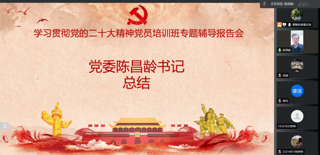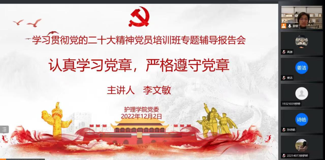 根据学院学习贯彻党的二十大精神党员培训班方案安排,12月2日晚上7点,BV伟德官方网站通过腾讯会议线上举行第二次专题辅导报告会。本次报告会由学院党委副书记李文敏同志主讲,主题为“认真学习党章,严格遵守党章”。学院全体党员、发展对象、入党积极分子以及部分学生马克思主义学习小组成员约230人参加了报告会。报告会由学院党委书记陈昌龄同志主持。