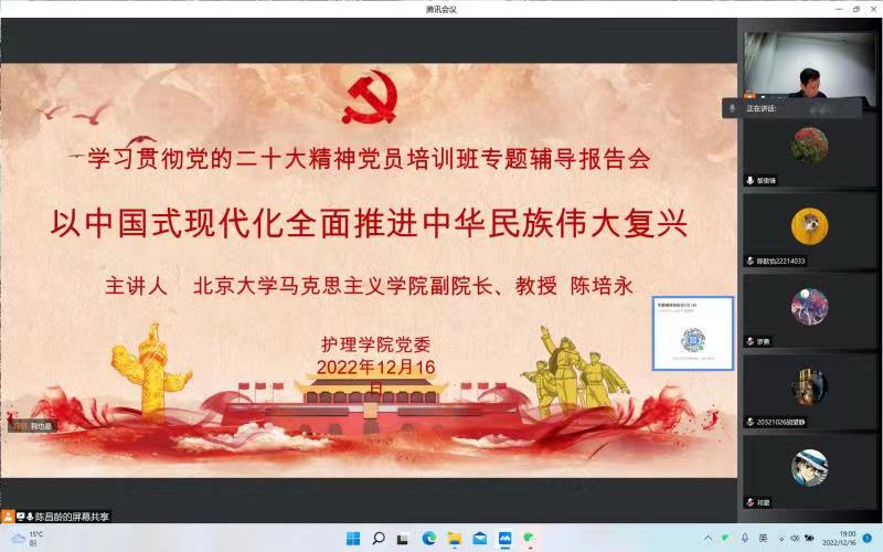 根据学院学习贯彻党的二十大精神党员培训班方案安排,12月16日晚上7点,BV伟德官方网站党委通过腾讯会议举行学习贯彻党的二十大精神党员培训班第三次专题辅导报告会。本次专题辅导报告的主题是:以中国式现代化全面推进中华民族伟大复兴,主讲人为北京大学马克思主义学院副院长陈培永教授。学院全体师生党员、发展对象、入党积极分子以及马克思主义学习小组近200人集体收看了中国干部网络学院门户网站“学习贯彻党的二十大精神网上专题班”相关辅导报告视频。专题辅导报告会由学院党委陈昌龄书记主持。
