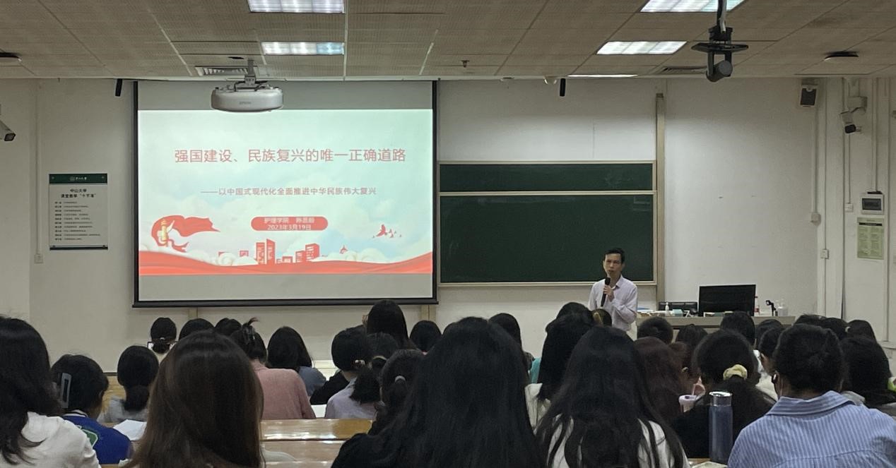 3月19日上午,陈昌龄书记在北校园新教201课室为全体本科生讲授了题为《强国建设、民族复兴的唯一正确道路——以中国式现代化全面推进中华民族伟大复兴》的思政课。2月7日,习近平总书记在新进中央委员会的委员、候补委员和省部级主要领导干部学习贯彻习近平新时代中国特色社会主义思想和党的二十大精神研讨班上发表重要讲话。习近平总书记深刻指出:“概括提出并深入阐述中国式现代化理论,是党的二十大的一个重大理论创新,是科学社会主义的最新重大成果。”“实践证明,中国式现代化走得通、行得稳,是强国建设、民族复兴的唯一正确道路。”陈昌龄书记的思政课主要从四个方面进行讲授:一是党的二十大报告概括提出并深入阐述中国式现代化理论;二是从历史维度解读中国式现代化——时间的流淌,沉淀着一代代人的梦想和奋斗;三是中国式现代化是一项伟大而艰巨的事业,前途光明,任重道远;四是实现中华民族伟大复兴,需要一代代人接续奋斗,未来寄希望于青年。