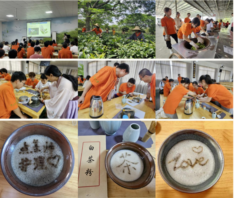 本次劳动教育主题实践活动做到理论与实践深度融合,既有关于茶的起源和发展史、茶的分类和制作工艺、茶文化艺术等专题讲座,也有采茶、制茶、点茶等制作工艺的实际体验。茶叶研究所的专家为同学们讲授了《茶的起源》《茶的发展史》《茶叶制作工艺》三个专题讲座。同学们了解到茶叶的溯源和茶叶生产、出口贸易的现状,理解了蕴含在茶中的“道法自然”的真谛与自古以来喝茶品茗的文化习俗,视野得到了进一步的开阔。在采摘环节,同学们顶着炎炎夏日,冒着高温酷暑,克服内心对飞虫的恐惧,走入茶园将茶芽一根一根地掐下,从生疏到熟练,从慌张到放松到享受。慢慢地,竹娄内的茶叶越来越多,越装越满,脸上的汗珠和笑容也越来越多。在杀青环节,同学们戴着手套,在200多度高温的炒锅内不停翻炒,茶叶的芳香逐渐在空气中弥漫开来,冲散了大家的燥热与疲惫。在揉捻环节,老师强调力道不能太猛,也不能太柔,大家明白了有些事情解决靠的是技巧,而不是力气。最后是古代宋朝“七汤点茶法”的点茶体验,炙茶、碾茶、罗茶、侯汤、熁盏、点茶,讲究慢中求稳、稳中有力,更是将同学们的学习热情推到了最高点。