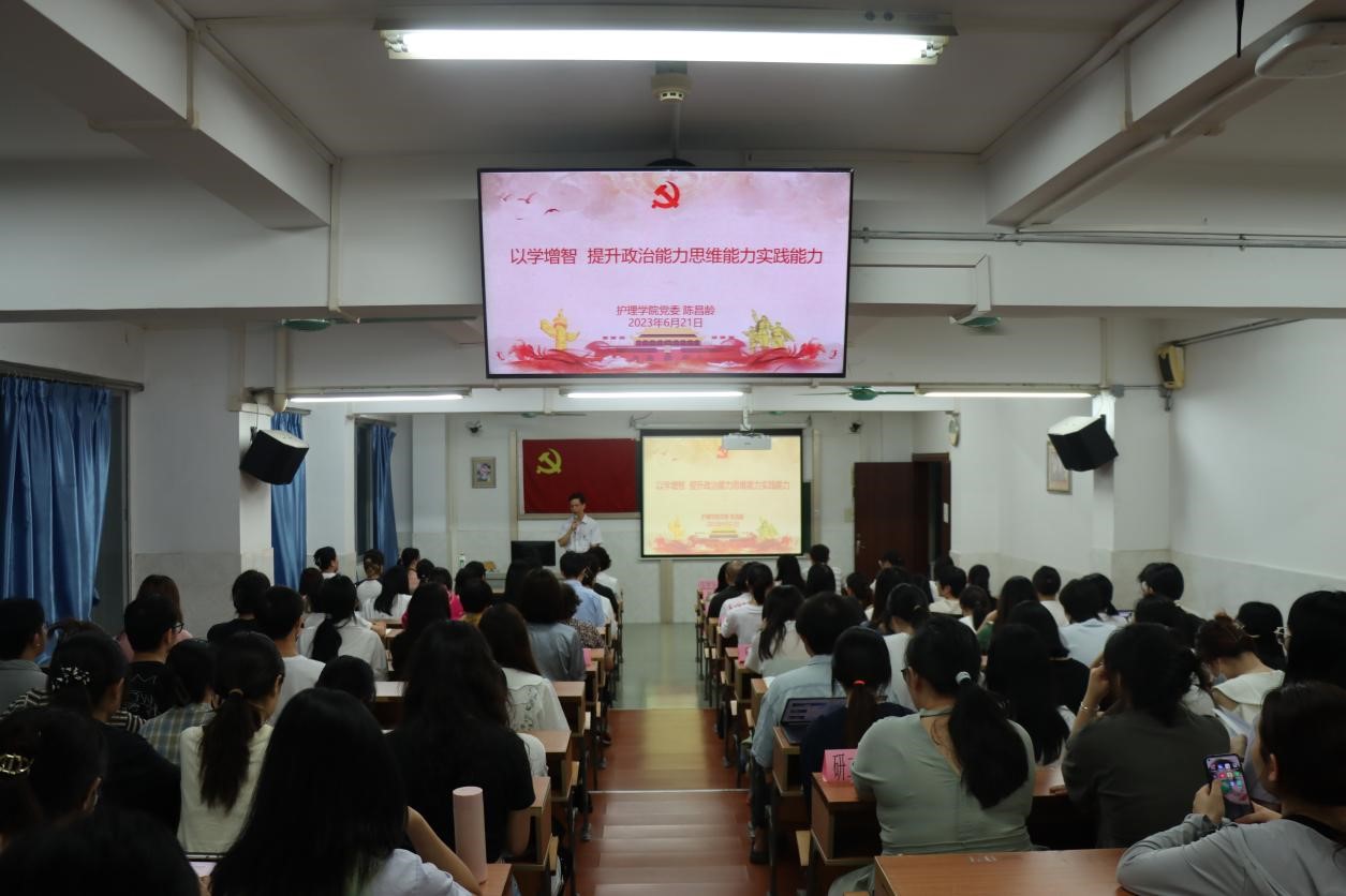 6月21日晚上,学院党委书记陈昌龄在学院620课室为专任教师党支部、教职工党支部、退休教职工党支部、博士研究生党支部及部分党员发展对象讲授题为《以学增智 提升政治能力思维能力实践能力》的专题党课。陈昌龄指出,如何做到以学增智,习近平总书记从提升政治能力、提升思维能力、提升实践能力三个方面提出明确要求。陈昌龄结合学院正在开展的主题教育谈了自己的理解和体会。陈昌龄强调,党员干部只有努力追求学思用贯通、知信行统一,认认真真、踏踏实实体悟思想、联系实际、掌握方法,才能更进一步把习近平新时代中国特色社会主义思想变成改造主观世界和客观世界的强大思想武器,在新时代新征程伟大实践中转化为强大力量。