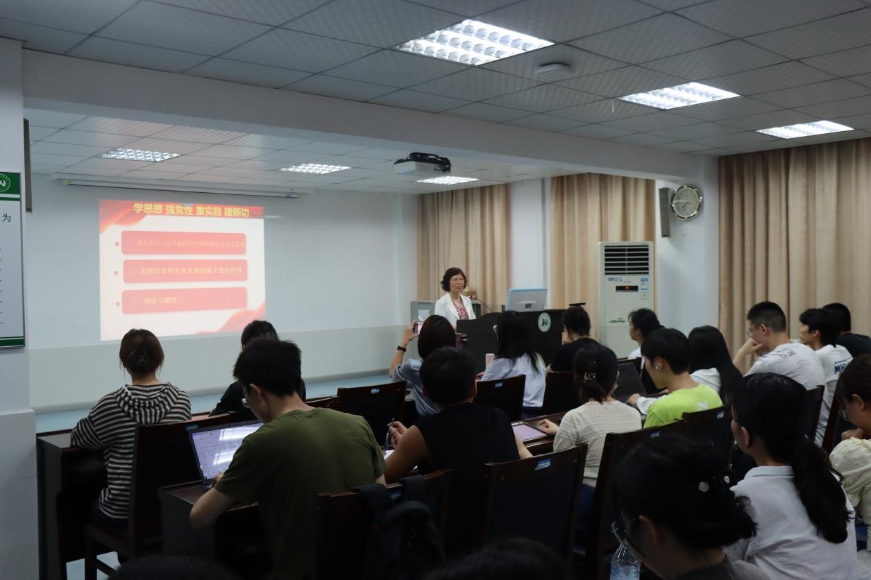 6月21日晚上,副院长万丽红在学院二楼东讲学厅为本科生党支部全体党员和发展对象讲授题为《学思想 强党性 重实践 建新功》的专题党课。万丽红首先谈了自己学习《习近平新时代中国特色社会主义思想专题摘编》中“坚持以人民为中心”和“实施科教兴国战略,强化现代化建设人才支撑”等部分著作的体会。接着,万丽红结合实际,谈了本科生党支部应该如何落实主题教育“学思想、强党性、重实践、建新功”的总要求,发挥好战斗堡垒作用和党员先锋模范作用。万丽红最后强调,作为一名学生党员,要不忘初心、牢记使命,时刻牢记党员身份,牢记党员职责和使命担当,为健康中国战略贡献力量。
