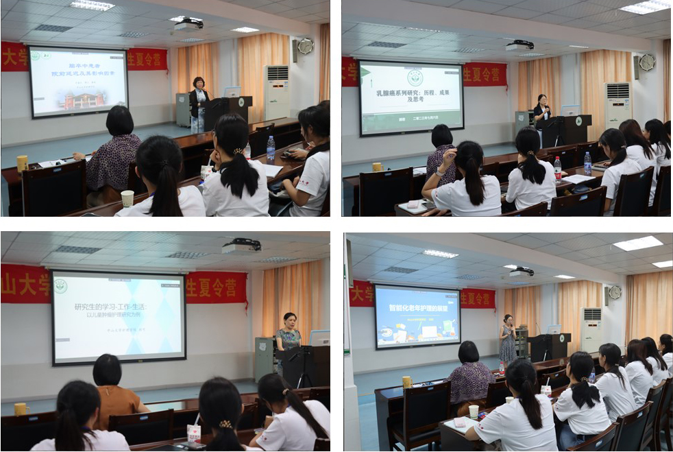 在名师讲座环节,万丽红教授、颜君教授、刘可副教授以及张琪副教授分别以“脑卒中患者的院前延迟及其影响因素”、“乳腺癌系列研究:历程、成果及思考”“研究生的学习-工作-生活:以儿童肿瘤护理研究为例”以及“智能化老年护理的展望”为主题作了学术分享和报告。四位名师与营员们分享了学术前沿知识,以及护理科研之路上经验、成果与思考等,并与营员进行讨论互动,加深了彼此的了解,建立了师生情谊。