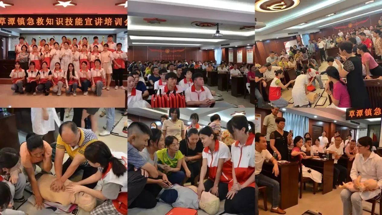 7月15日下午,为进一步推广普及急救常识,在草潭镇党委政府的协助下,师生党员在草潭镇镇政府三楼会议室为当地各中小学教职工代表、村干部、派出所民警及海警大队队员开展了急救知识技能宣讲和培训会,培训采取“知识讲授+现场演示+实践操作”模式开展,内容涵盖心肺复苏术、海姆立克气道异物清除术和止血包扎等项目。在培训过程中干部群众认真听讲和记录,积极互动和参与现场操作。培训结束后,大家纷纷表示,在培训中获益良多,切实提高了应对突发事故的能力,为今后在突发事件中更好地开展自救与救助他人、最大限度地救护和帮助受伤群众积累了宝贵经验。