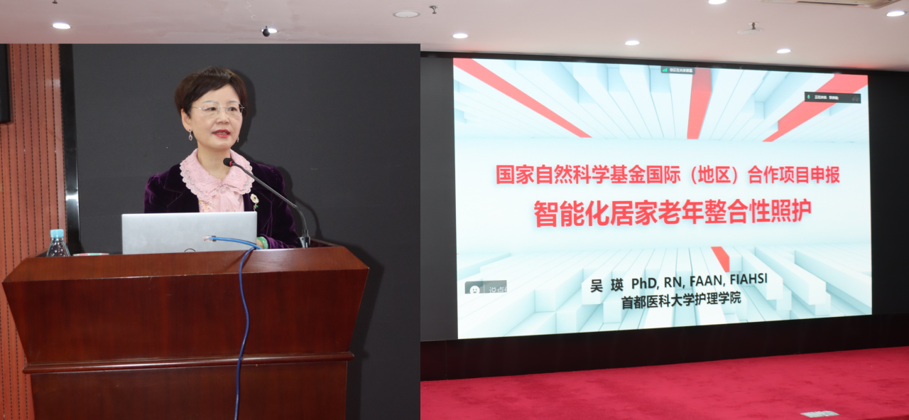 吴瑛教授现为首都医科大学临床BV伟德官方网站院长,美国护理科学院院士,教育部护理专业认证工作委员会主任委员,国务院学位委员会护理学科评议组召集人。吴教授在智慧护理领域做出了杰出贡献,率先融合人工智能、物联网、大数据、云计算、虚拟现实、元宇宙等先进技术,在老年护理、慢病管理和护理教育领域开展护理人工智能交叉研究。本次名师讲坛上,吴教授首先系统地为大家介绍了国家自然科学基金国际(地区)合作项目的申报,主要包括:(1)国家自然科学基金项目简介及其聚焦的重点;(2)护理学科的基础研究,该类研究的目的不仅要解释护理现象发生的原因,还要描述现象与原因的内在关系;(3)管理科学部项目设置的特点,主要资助人类社会组织管理及经济活动客观规律的基础科学研究。紧接着,吴教授对自己研究团队的国自然国际(地区)合作项目——“智能化居家养老整合性照护” 进行了详细介绍,包括:(1)项目背景:老年人失能的原因及机制,老年护理领域面临的痛点问题;(2)研究思路:神经反射是本研究的设计原理,护理决策支持系统和专家系统的实现原理;(3)“智能化居家养老整合性照护”程序的展示。