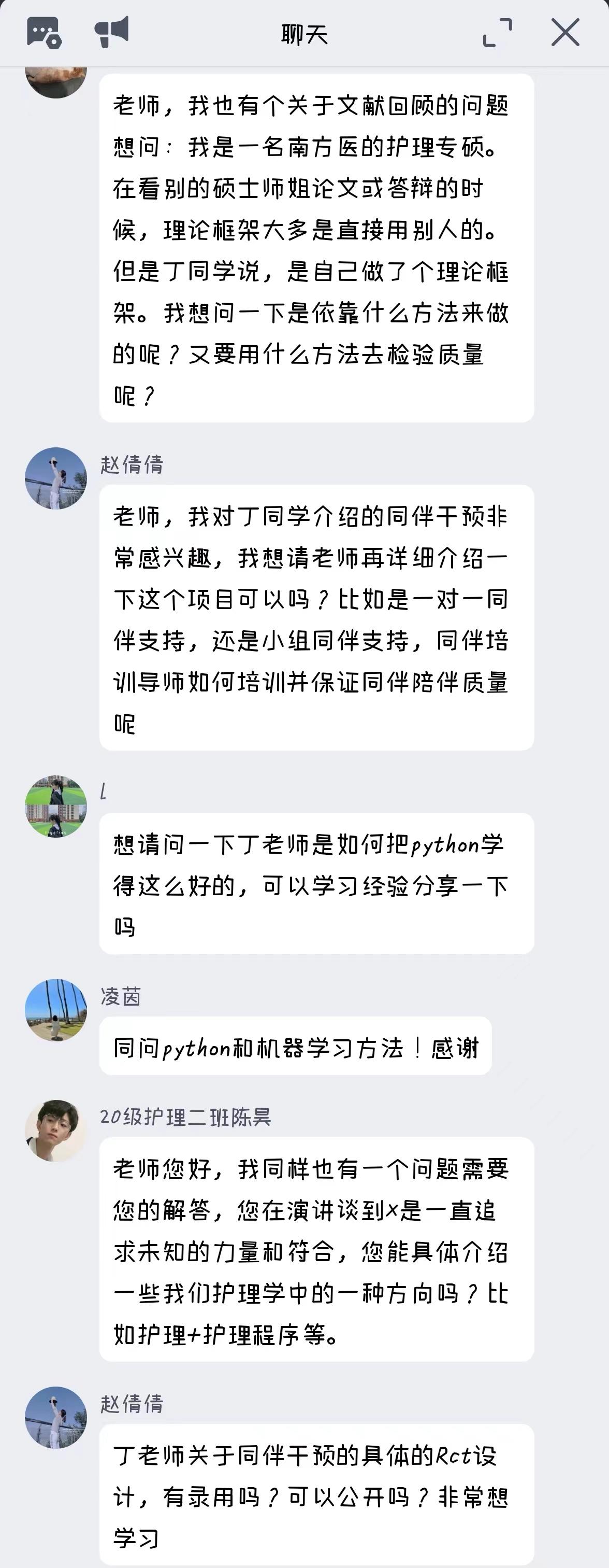 本次新星学子论坛上,丁鹤霄同学带来“A1+X在青少年心理健康的应用:我的成长与实践”的主题分享。讲座第一部分,丁鹤霄围绕自己团队的“青少年心理健康系列研究(PeerInt项目)”进行研究经验分享,包括量表的评价、质性研究的开展、多角度诠释模型有效性等。对于初学者,丁鹤霄提到了3点建议:面向问题的学习和讨论、高效的合作与整合资源、有反馈的重新思考。在干预性研究部分,即数字健康怎么赋能青少年心理健康实践,丁鹤霄分享了如何有效地构建干预方案、同伴导师的招募和培训、随机对照试验的质量控制、制定和同质化干预内容及临床实施等内容。讲座的第二部分为多模态分析在心理健康研究中的应用,包括多模态数据的概念及特点、多模态数据的分析及机器学习在多模态数据分析中的运用。丁鹤霄分别以青少年抑郁和跌倒方向的论文为例为我们讲解了多模态数据在真实世界中的分析及应用。最后,丁鹤霄指出,Nursing+X中最重要的是X,例如人文、心理、材料等,同学们要结合研究趋势、临床应用及个人长处,探索属于自己的X。