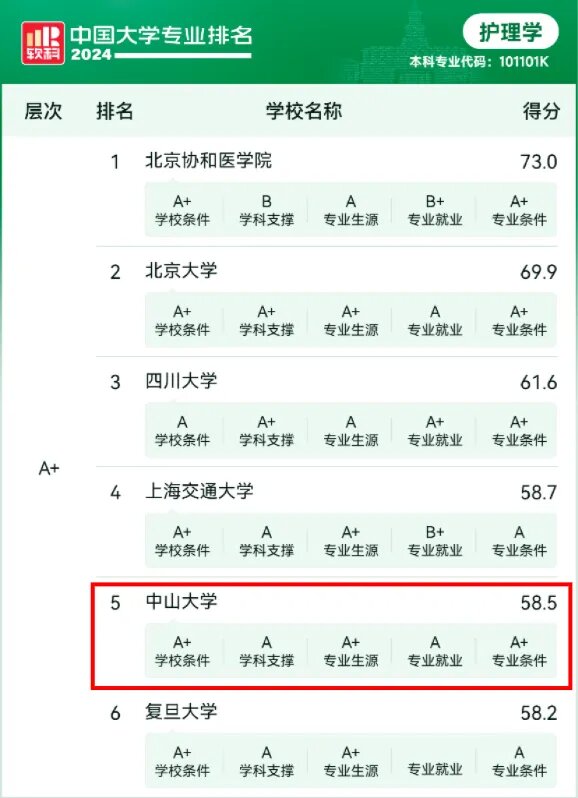 护理学专业排名结果如下: